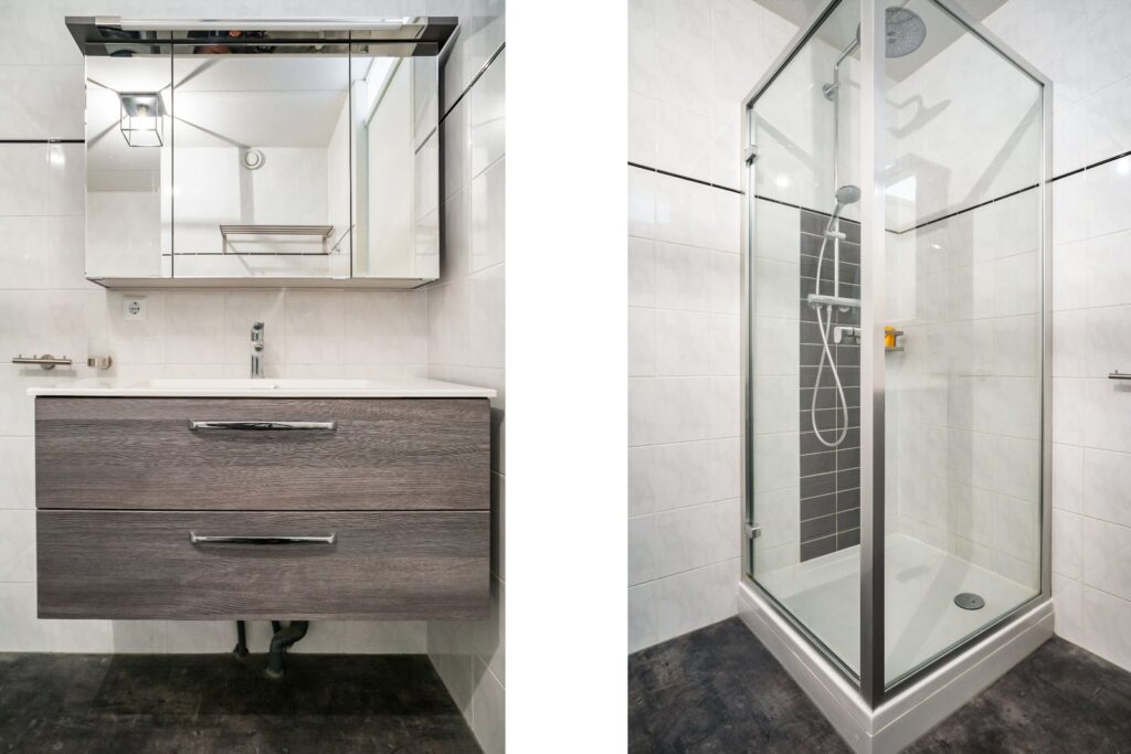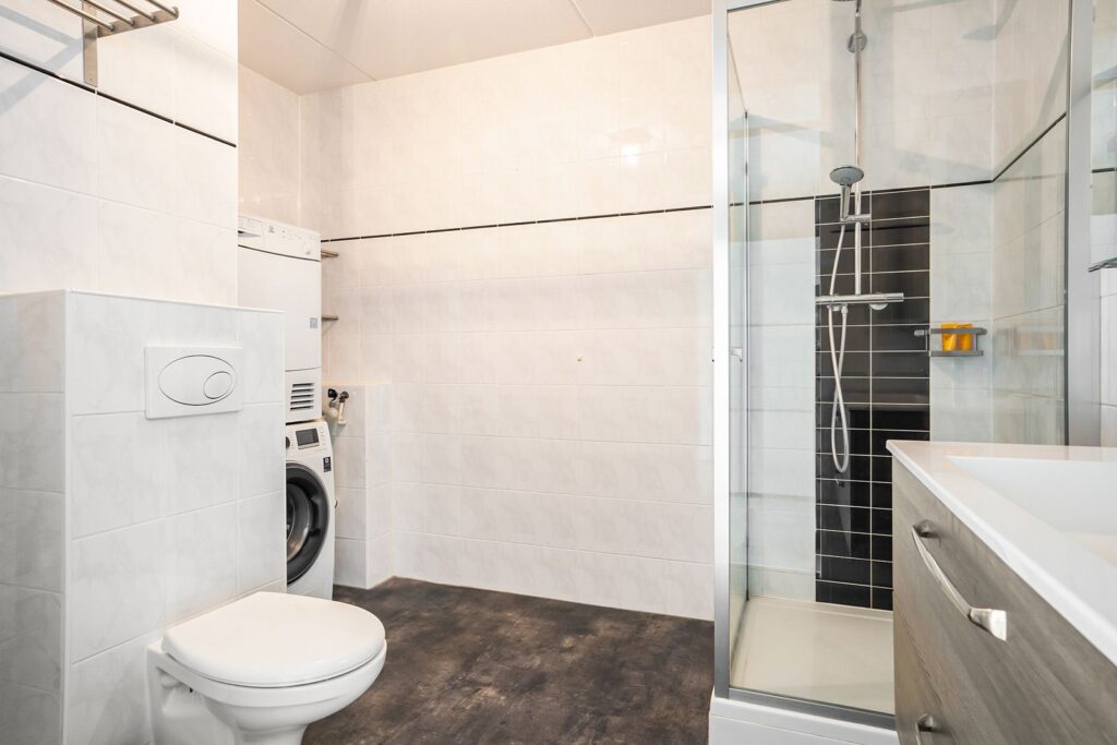 Op deze verdieping vindt u ook de ruime badkamer. De badkamer is volledig betegeld en is voorzien van een toilet, douche en badkamermeubel. De badkamer heeft een aparte hoek met aansluitingen voor de wasmachine en droger.