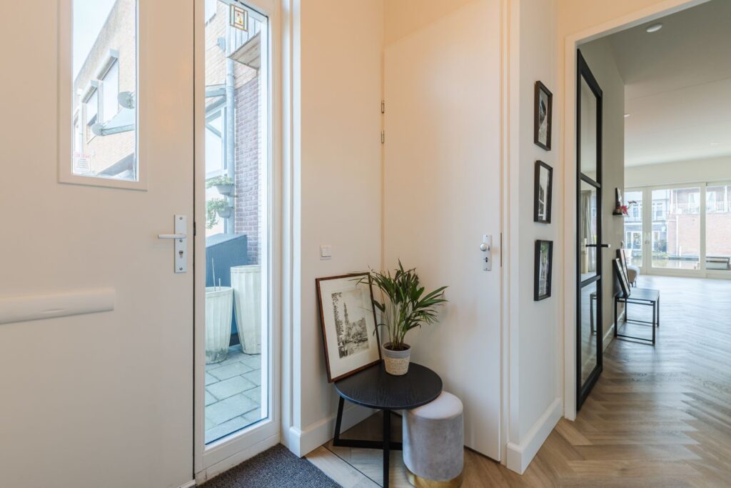 Naast de woning geniet u van een dubbele parkeerplaats op eigen terrein. U kunt de woning zowel betreden via de inpandige berging als via de voordeur. De woning beschikt over een ruime, lichte hal met een grote, afgesloten garderobe. Vanuit de hal heeft u door de glazen deur al prachtig uitzicht op de Oude Rijn. Daarnaast heeft u vanuit de hal toegang tot de inpandige berging van circa 10 m², het toilet en de ruime woonkamer. De gehele benedenverdieping heeft vloerverwarming en een imposante plafondhoogte van circa 3,3 meter.