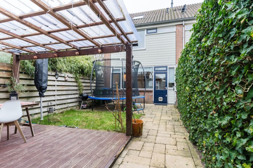 De onderhoudsvriendelijke achtertuin met gezellige overkapping, ligt op het noordwesten, waardoor je in de middag en avond heerlijk van de zon kunt genieten. Achterin staat een stenen berging met elektra en er is een handige achterom, ideaal voor fietsen en spelende kinderen.