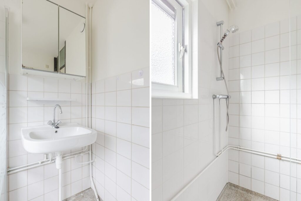 De badkamer beschikt over een inloopdouche, wastafel en de originele granitovloer. De aansluiting voor een wasmachine bevindt zich zowel in de badkamer als keuken.