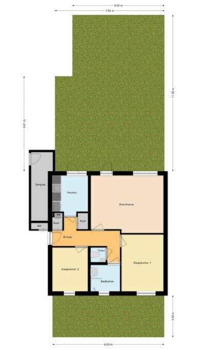 This pleasant corner house features a large garden. The bright, sunny, and practically laid-out apartment of approximately 66 m² offers a lovely living room, two generously sized bedrooms, a bathroom, a spacious hallway with a wardrobe/storage closet, a closed kitchen, and an external storage unit. There is a separate toilet in the hallway, and the home is equipped with both mechanical and natural ventilation.