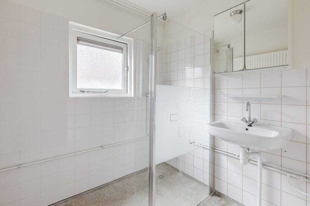 The second bedroom, also located at the front, is a spacious room that can be used as a study, children’s room, or walk-in closet. Both bedrooms border the front garden, which adjoins a pedestrian path—so there is less traffic nuisance. The bedrooms and bathroom were recently painted (2026), and one tiled wall in the bathroom has been completely renewed.