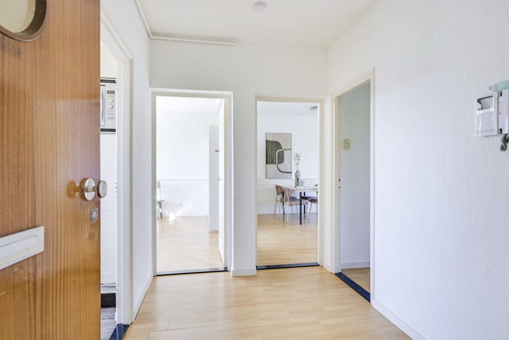 Shared, secure entrance with intercom, mailboxes, and staircase. Access to the basement, which houses a shared bicycle shed and a private storage unit.