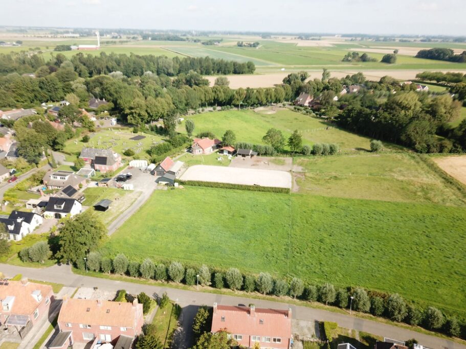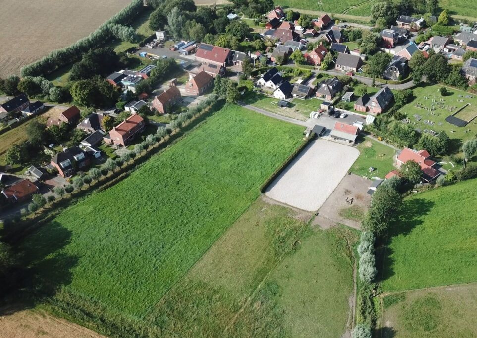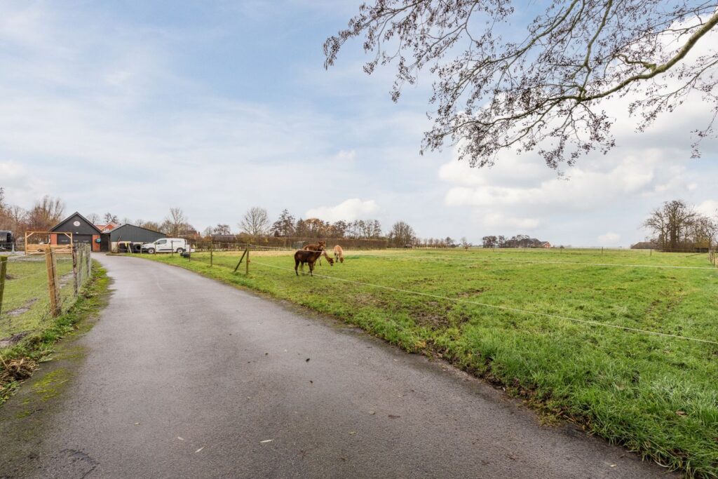 Via de elektrische toegangspoort rijdt u de royale oprit op, direct omgeven door rust en ruimte. Aan de linkerzijde bevindt zich een kleine dierenweide. Aan de rechterzijde ligt een groot perceel, verdeeld over drie afzonderlijke gedeelten, ideaal voor het gescheiden houden van dieren of voor afwisselend gebruik. De meidoornhaag tussen het weiland en de rijbak zorgt voor optimale privacy en blijft vrijwel het hele jaar mooi groen.