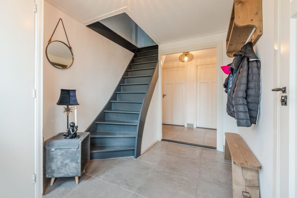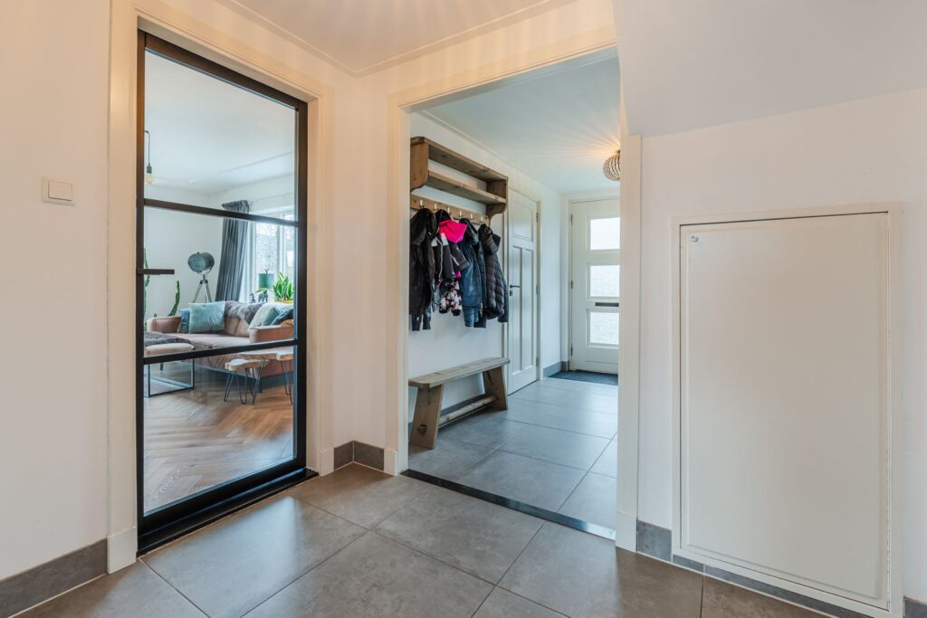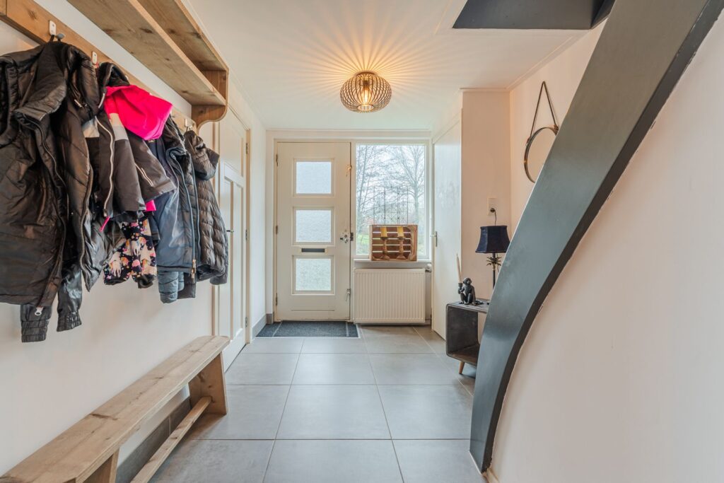 Via de voordeur betreedt u de woning in een ruime hal met trapopgang naar de eerste verdieping. Hier bevinden zich tevens het toilet aan de rechterzijde en de meterkast met waterontharder aan de linkerzijde. De hal vormt een prettige en centrale binnenkomst met toegang tot de diverse leefruimtes.