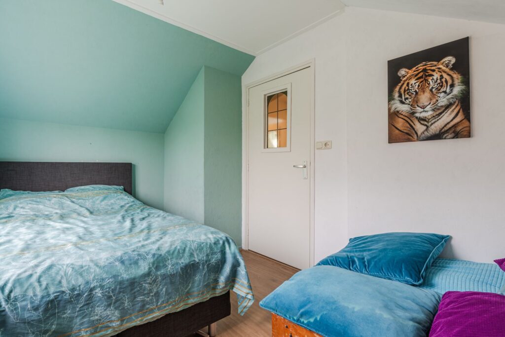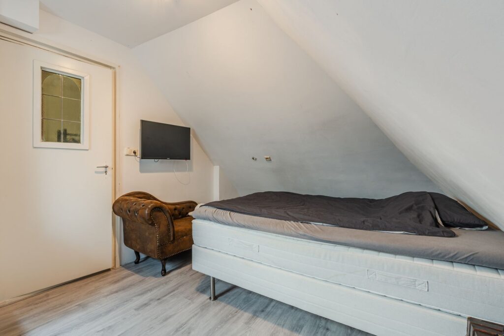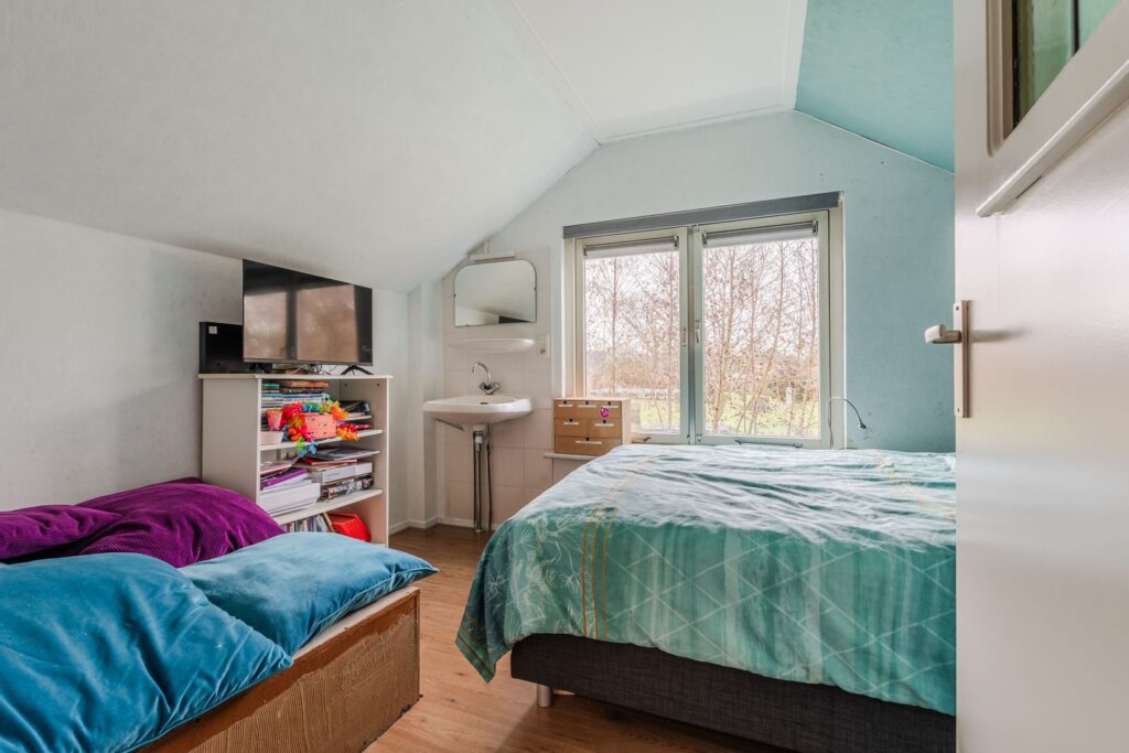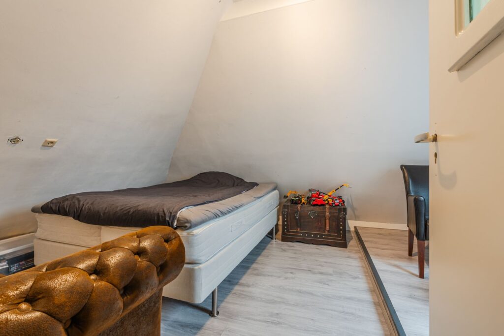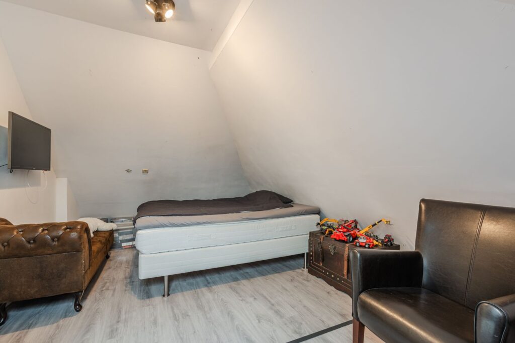 De verdieping beschikt over drie volwaardige slaapkamers. De royale hoofdslaapkamer is voorzien van een inbouwkast en knieschotten, wat zorgt voor extra bergruimte zonder in te leveren op leefruimte. De twee overige slaapkamers zijn eveneens ruim bemeten en groot genoeg voor het plaatsen van een tweepersoonsbed, ideaal als kinder-, logeer- of werkkamer. Een van de slaapkamers is bovendien uitgerust met een eigen wastafel.
