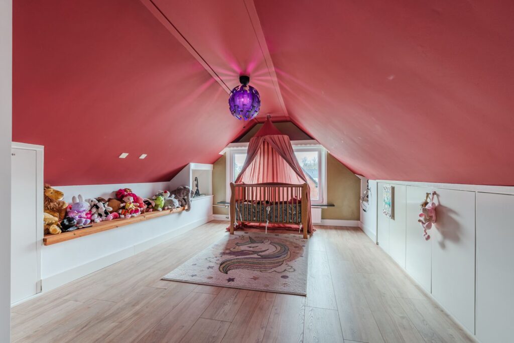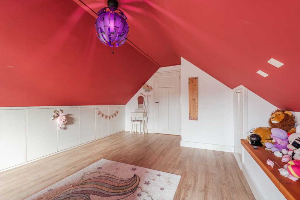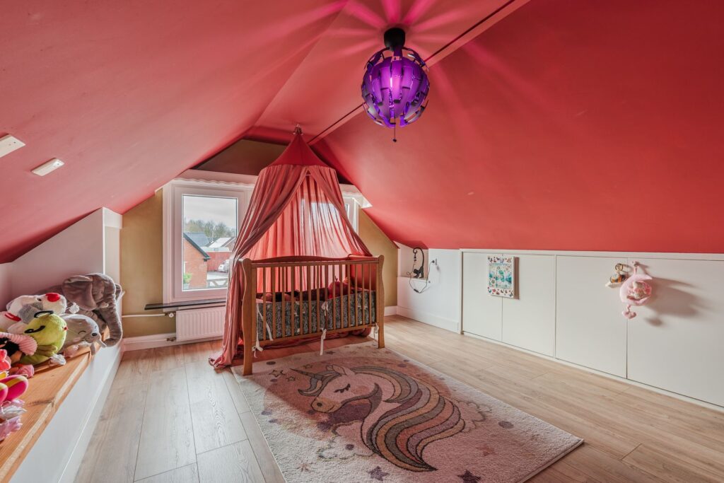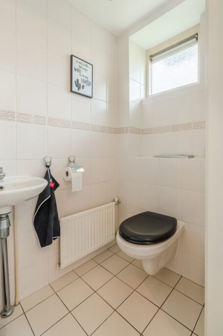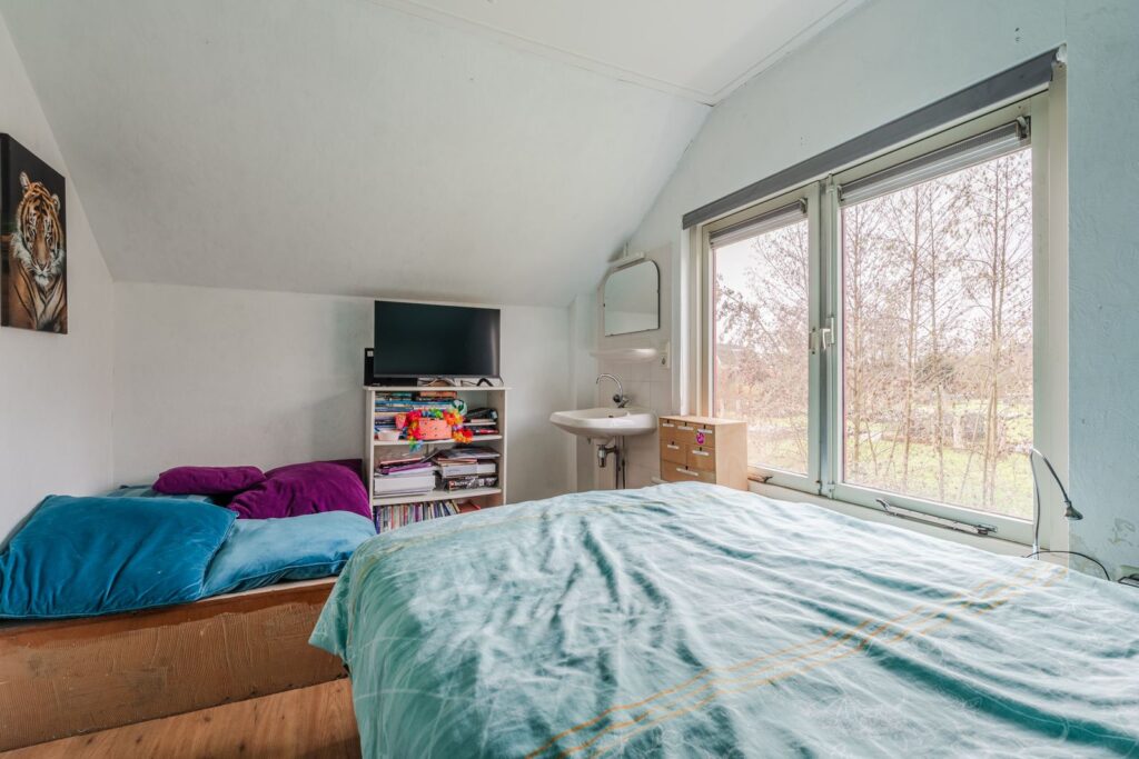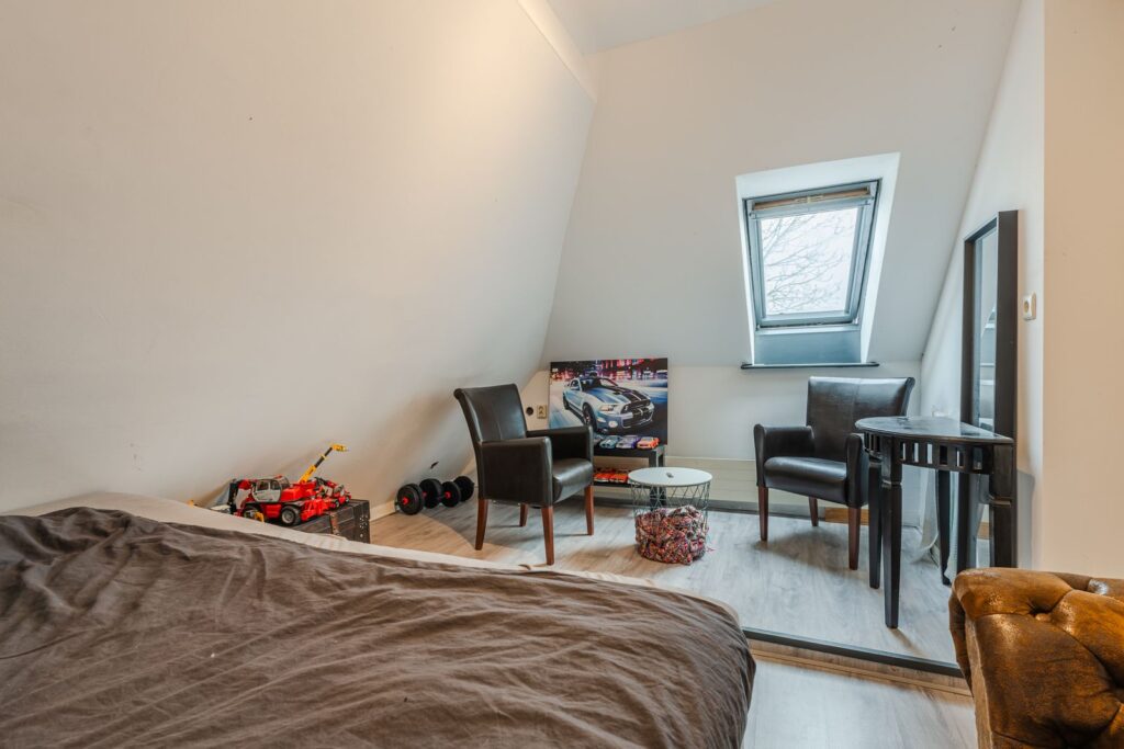 De verdieping beschikt over drie volwaardige slaapkamers. De royale hoofdslaapkamer is voorzien van een inbouwkast en knieschotten, wat zorgt voor extra bergruimte zonder in te leveren op leefruimte. De twee overige slaapkamers zijn eveneens ruim bemeten en groot genoeg voor het plaatsen van een tweepersoonsbed, ideaal als kinder-, logeer- of werkkamer. Een van de slaapkamers is bovendien uitgerust met een eigen wastafel.