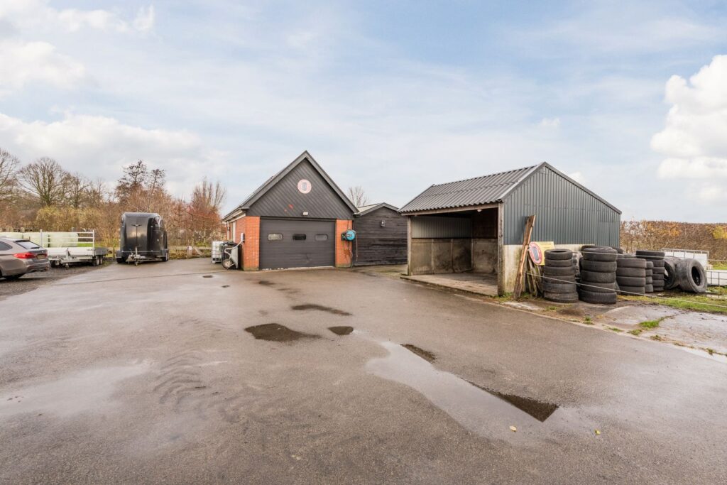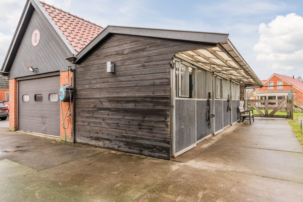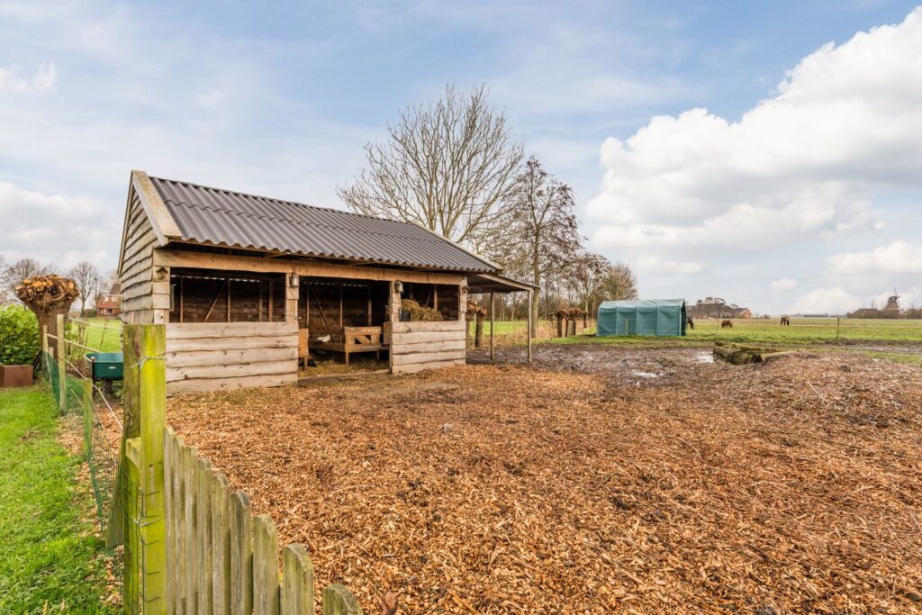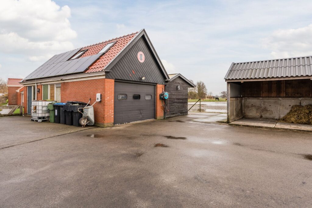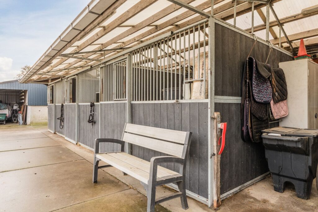 Vanaf de oprit bereikt u de ruime parkeerplaats, verhard met gebroken asfalt en geschikt voor meerdere auto’s en aanhangers. Tegenover de parkeerplaats bevindt zich de mestsilo met daarachter een praktische opslagruimte. Aansluitend treft u een schuur met zolder, voorzien van 12 zonnepanelen. Naast de schuur liggen drie nette stallen met een compacte zadelkamer, uitgerust met warmwatervoorziening. Daarnaast is er een extra inloopstal aanwezig waar dieren beschut kunnen staan tegen wind en regen, en in de zomer heerlijk schaduw vinden. In alle stallen en dierenverblijven is stromend water en elektriciteit aanwezig.