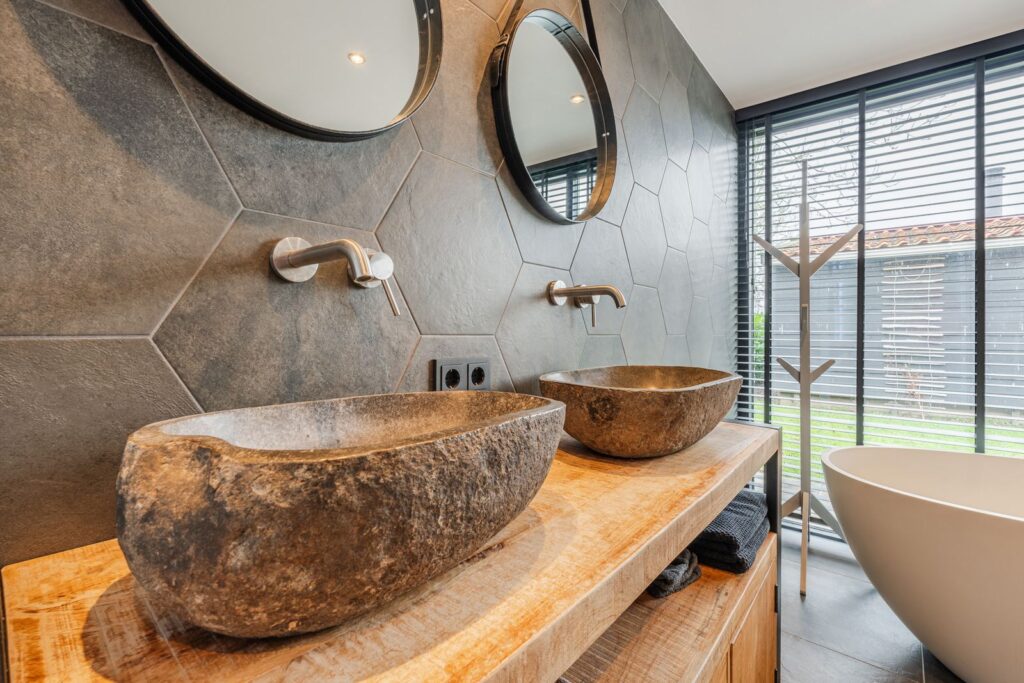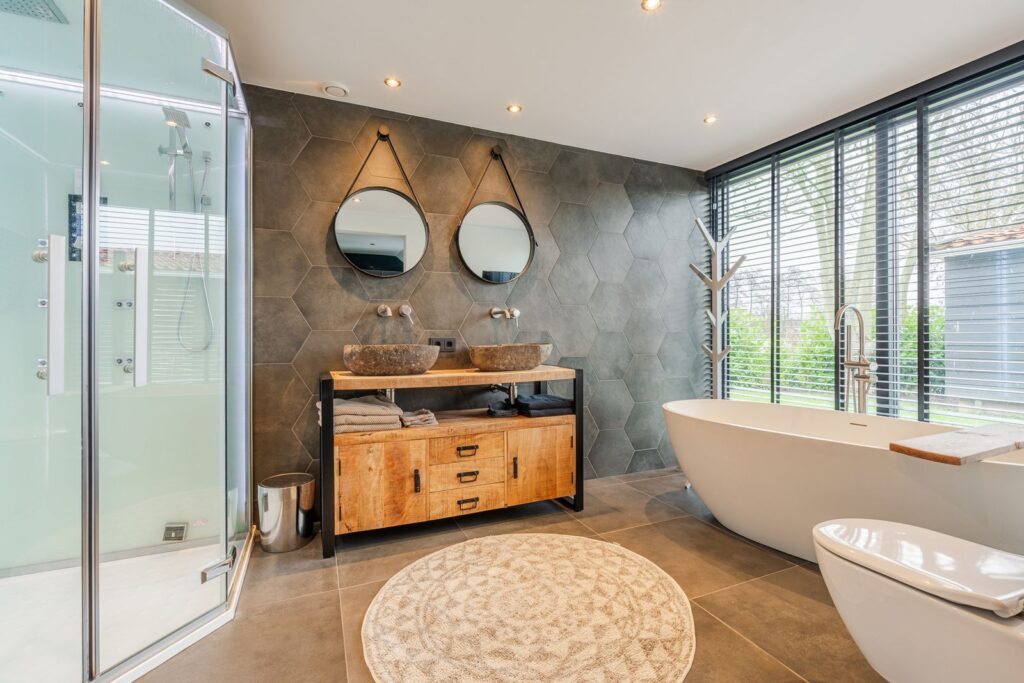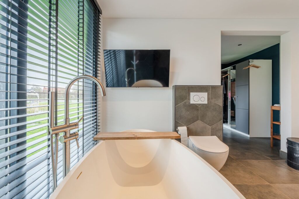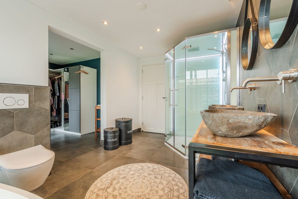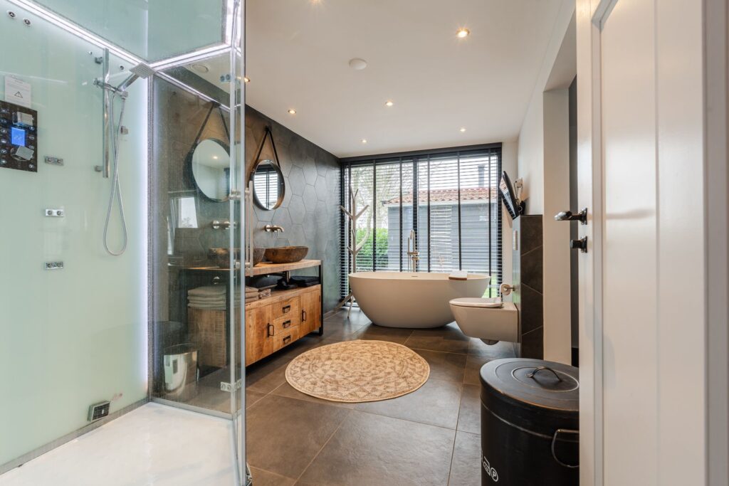 Op de begane grond een luxe badkamer met vrijstaand bad, stoomcabine en walk-in closet