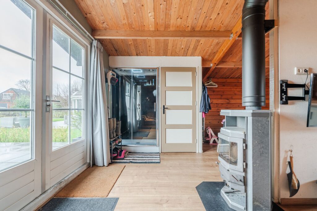 Naast de bijkeuken ligt een extra kamer met openslaande deuren naar buiten. Deze ruimte is multifunctioneel en uitstekend te gebruiken als kantoor aan huis, praktijkruimte of slaapkamer.