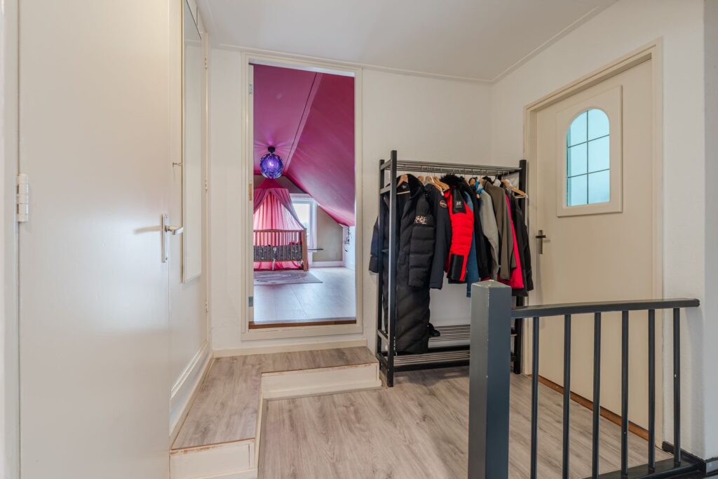 Via de overloop bereikt u de eerste verdieping, een praktische en comfortabele woonlaag met volop ruimte en slimme opbergmogelijkheden. Op de overloop bevinden zich een handige inbouwkast en een aparte kast met de CV-ketel en de aansluitingen voor de warmtepomp en vloerverwarmingsregelaar, alles netjes en efficiënt weggewerkt.