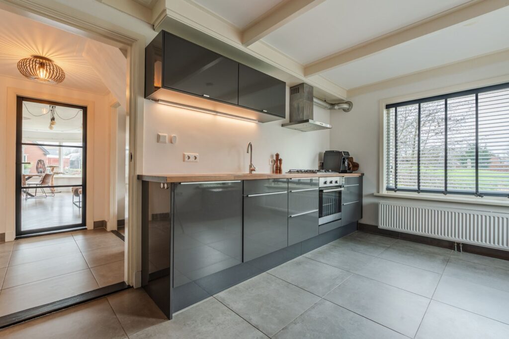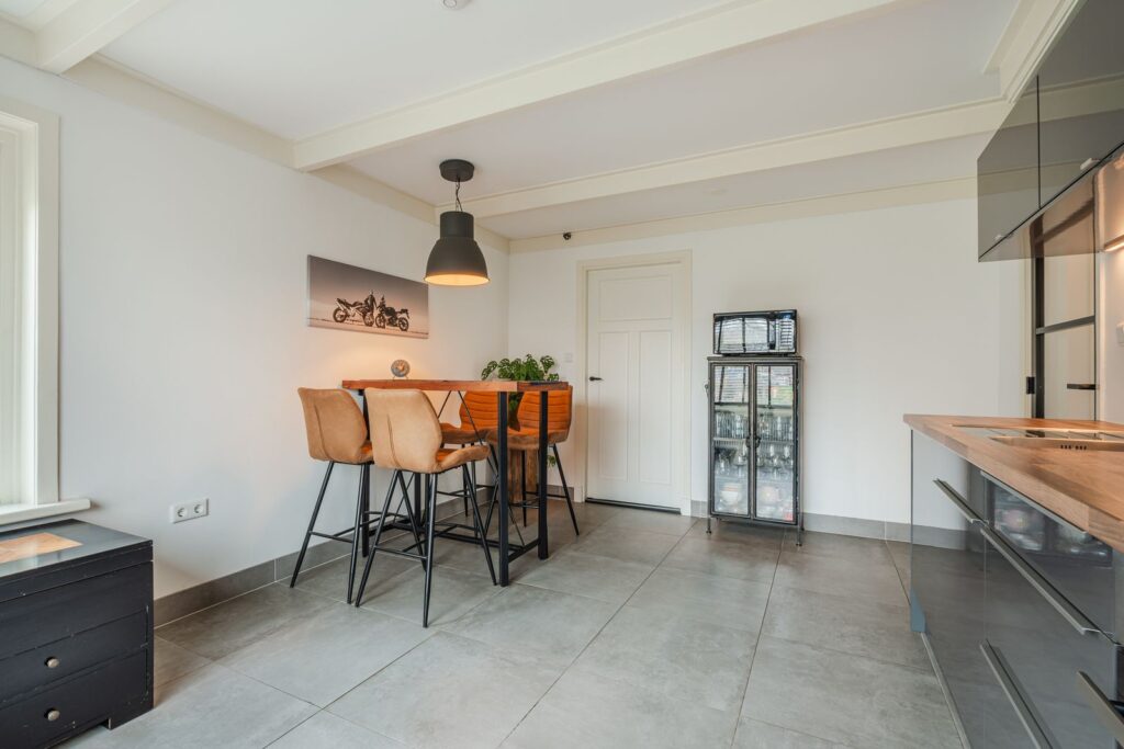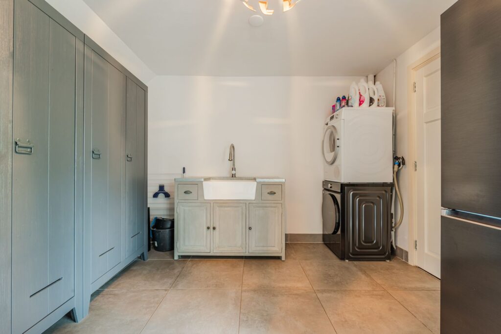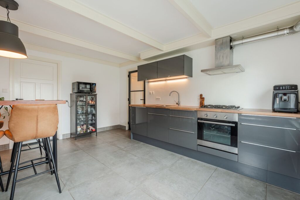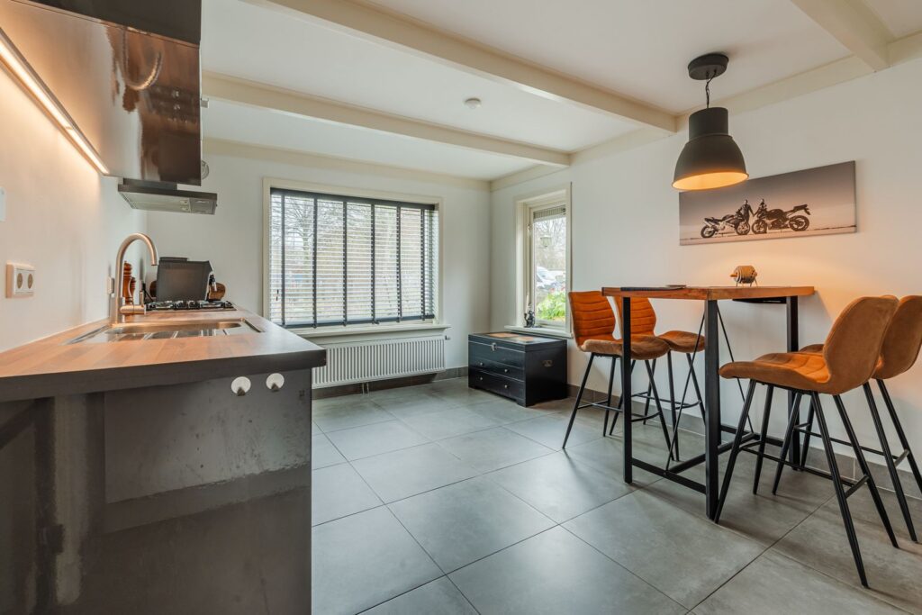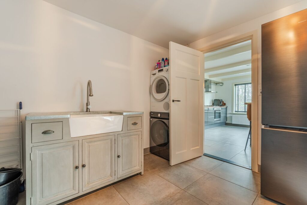 De ruime keuken bevindt zich in het karakteristieke, oude gedeelte van de woning. Aansluitend vindt u de praktische bijkeuken met extra bergruimte en witgoedaansluitingen. Aan weerszijden van de woning zijn toegangsdeuren van buitenaf naar de bijkeuken, wat zorgt voor extra gebruiksgemak. Boven de bijkeuken bevindt zich nog een kleine bergzolder, bereikbaar via een vlizotrap.