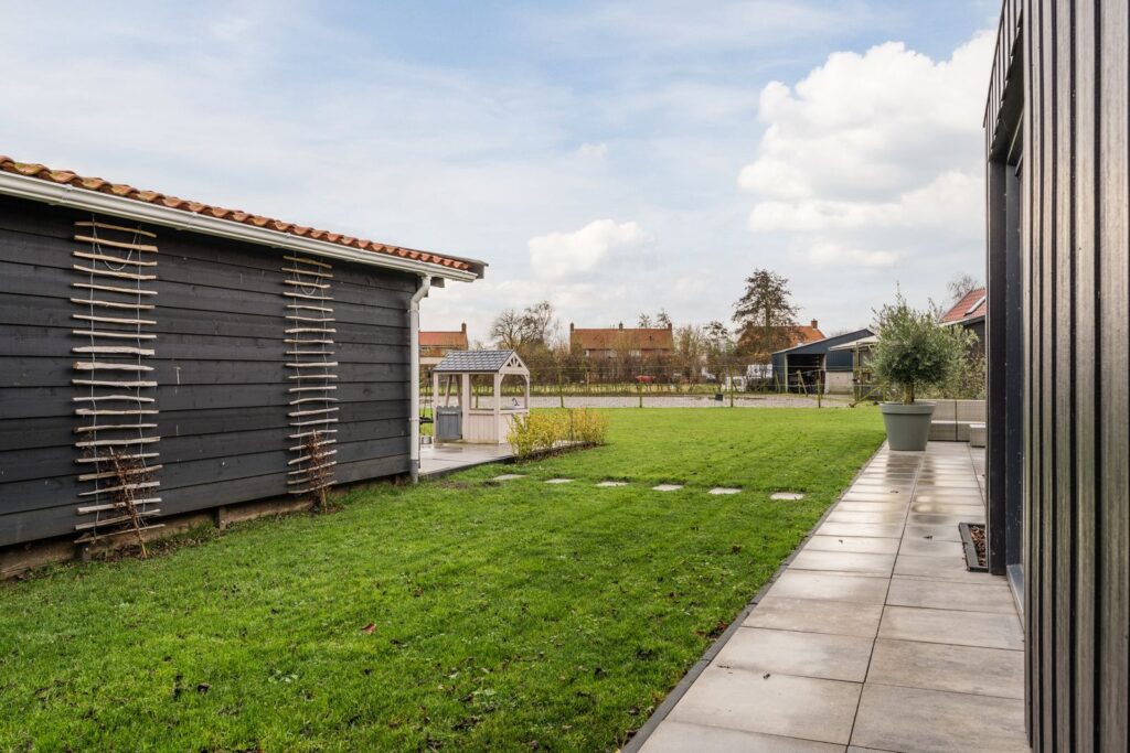 Achter de parkeerplaats en naast de dierenweide ligt de fraai aangelegde tuin. Het geheel bestaat grotendeels uit gazon, gecombineerd met een sfeervolle siertuin met leibomen. Meerdere aangelegde paden en terrassen zorgen ervoor dat u op elk moment van de dag een fijne plek in de zon of schaduw kunt vinden. Aan de rechterzijde van de tuin staat een volledig uitgerust tuinhuis, ideaal als gastenverblijf, werkruimte of hobbyruimte. Direct naast de woning is een overkapping gerealiseerd met daaronder een jacuzzi. Een heerlijke, privé wellnessplek waar u in alle rust kunt genieten van warmte en bubbels. Aan de voorzijde van de woning loopt een pad richting de Smydingheweg. Hier geldt recht van overpad, zodat u eenvoudig toegang heeft tot het postbakje aan de weg.