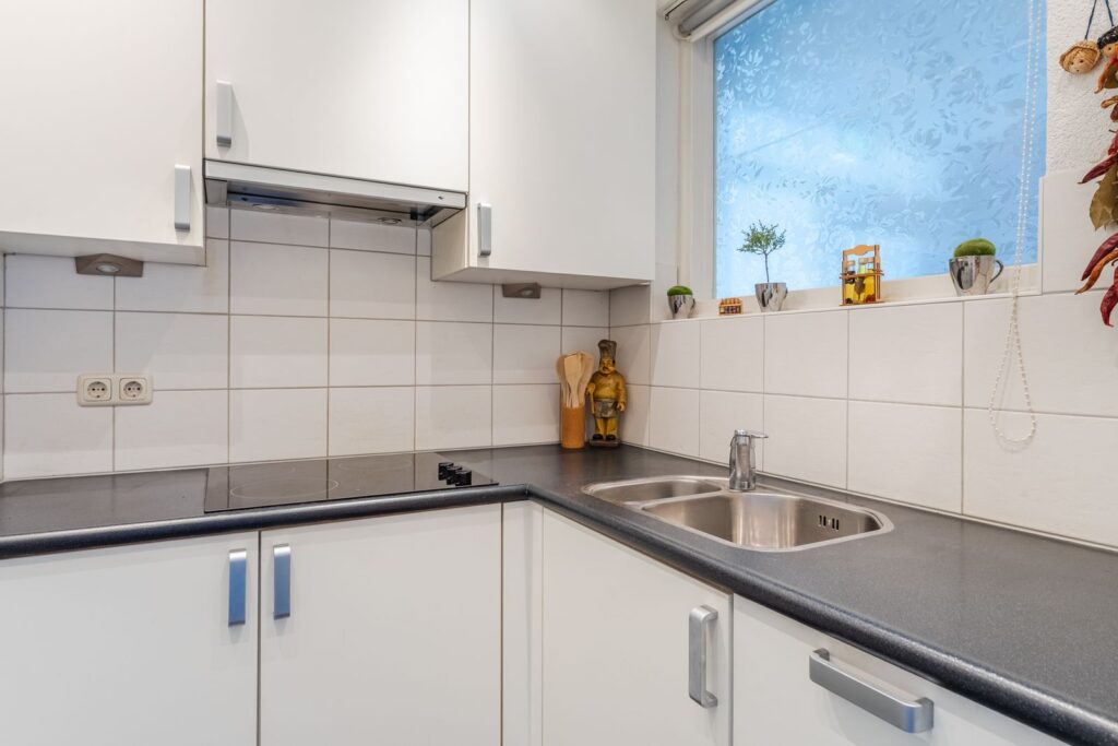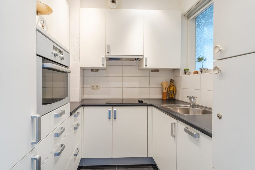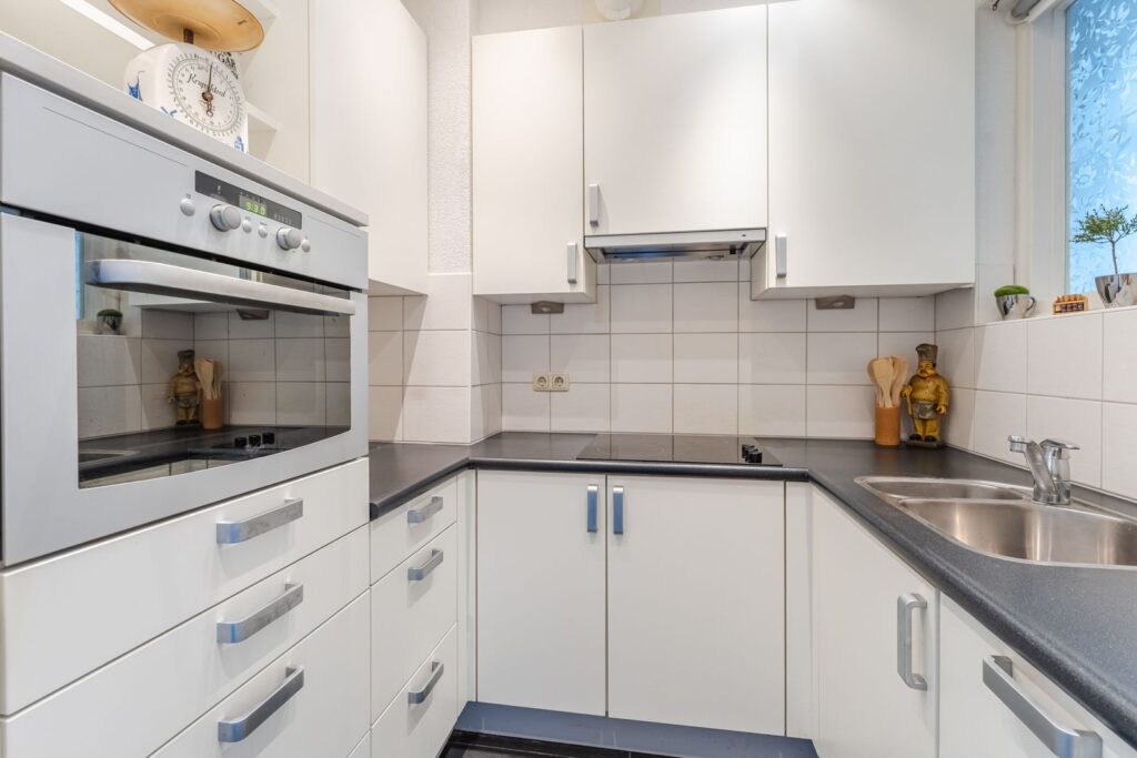 De dichte keuken is praktisch ingericht in een U-opstelling en voorzien van diverse inbouwapparatuur, waaronder een koelkast met vriezer, combimagnetron, keramische kookplaat, afzuigkap en een 45 cm vaatwasser.