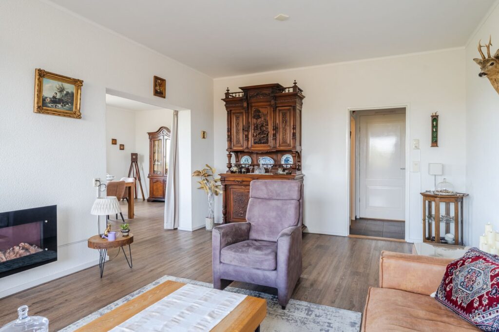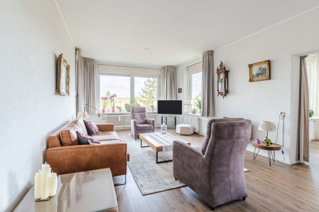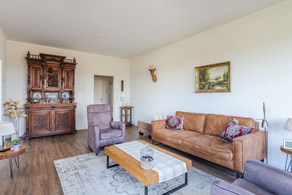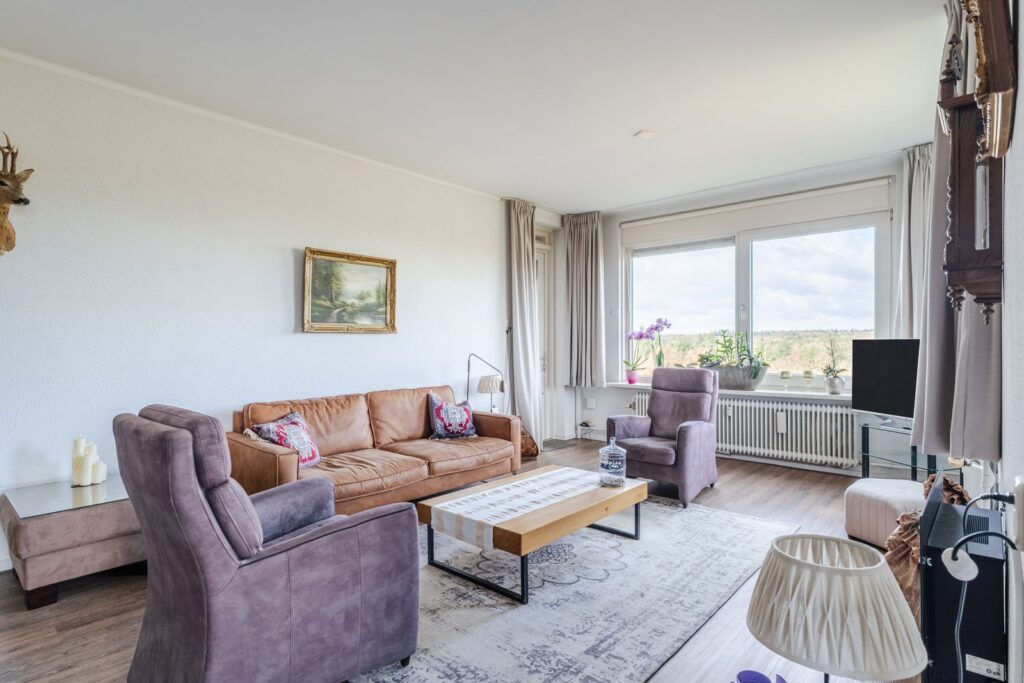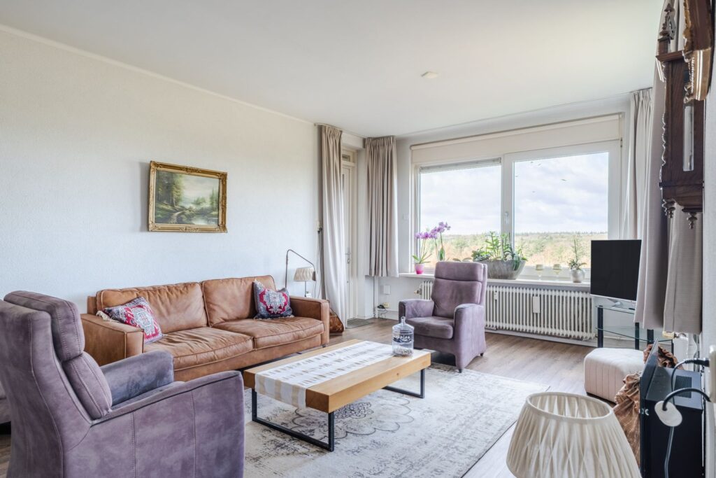 De lichte en brede woonkamer is een fijne leefruimte met een mooie lichtinval en een nette laminaatvloer. De wanden zijn afgewerkt met spachtelputz, wat zorgt voor een verzorgde uitstraling. Vanuit de woonkamer is er toegang tot het balkon, waar u heerlijk kunt genieten van het vrije uitzicht over de bossen.