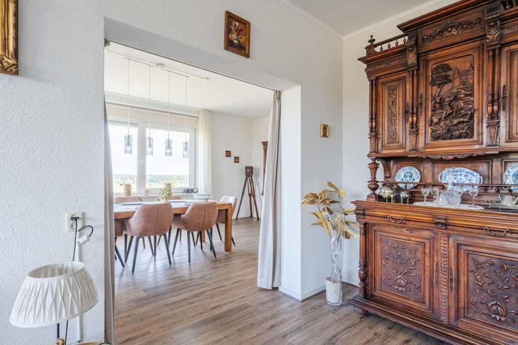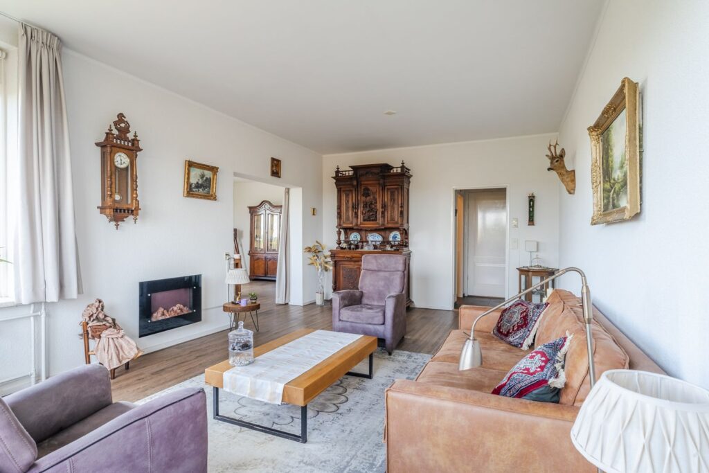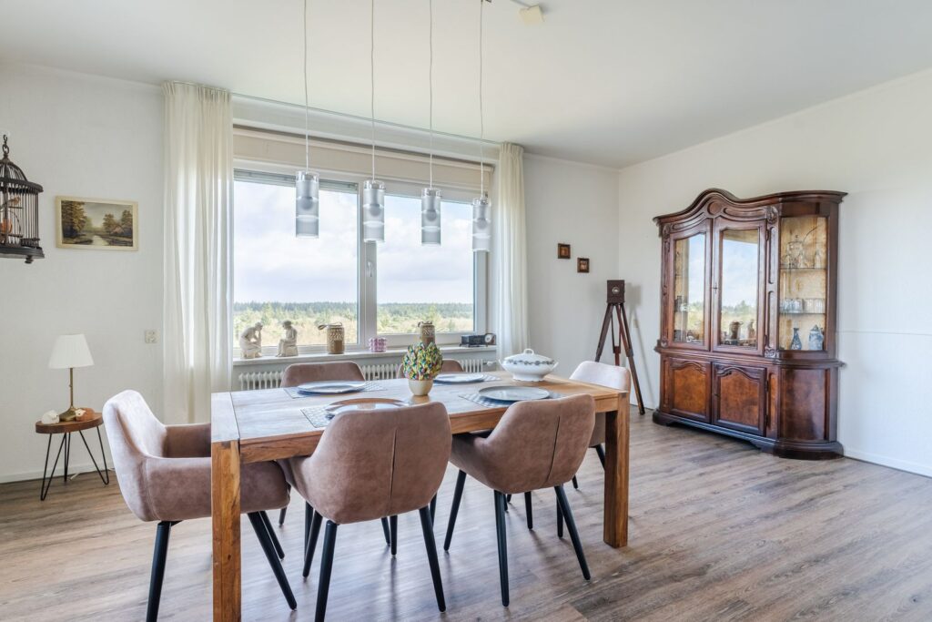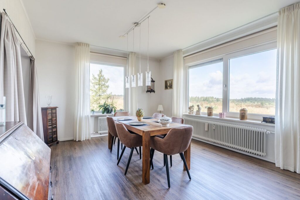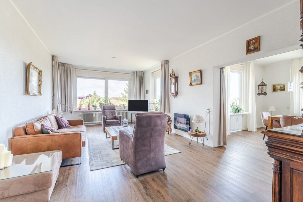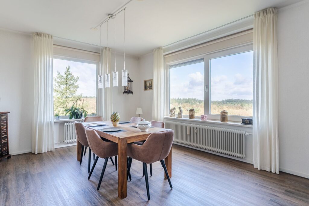 De lichte en brede woonkamer is een fijne leefruimte met een mooie lichtinval en een nette laminaatvloer. De wanden zijn afgewerkt met spachtelputz, wat zorgt voor een verzorgde uitstraling. Vanuit de woonkamer is er toegang tot het balkon, waar u heerlijk kunt genieten van het vrije uitzicht over de bossen.