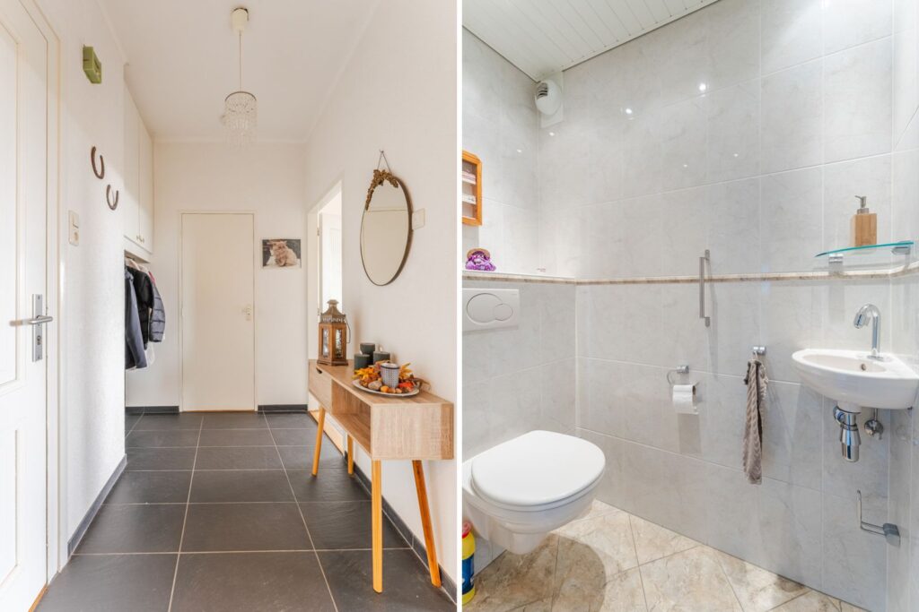 Via de entree komt u in de hal met een praktische nis voor kapstok en garderobe. Hier bevindt zich tevens de Daalderop boiler. Vanuit de hal bereikt u de moderne toiletruimte met zwevend toilet en fonteintje.