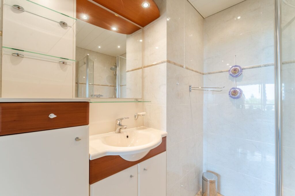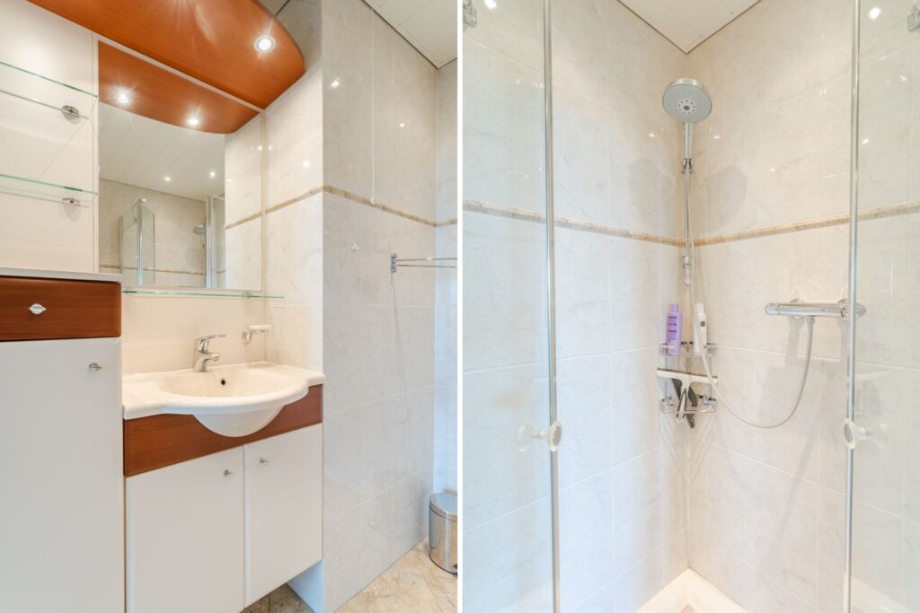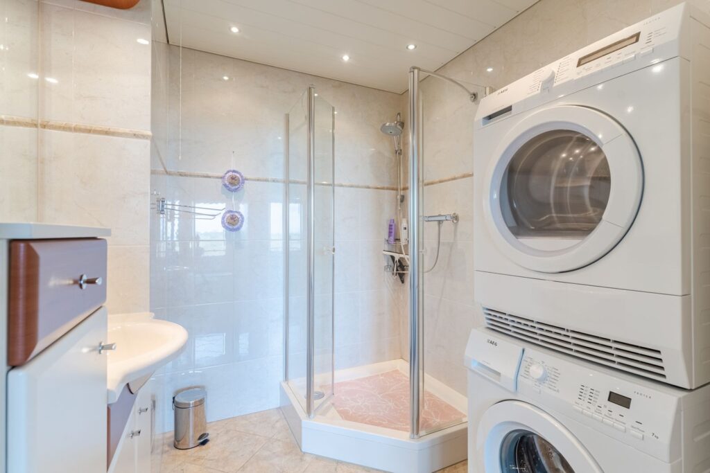 De badkamer is voorzien van een wastafelmeubel, douchecabine en aansluiting voor de wasmachine.