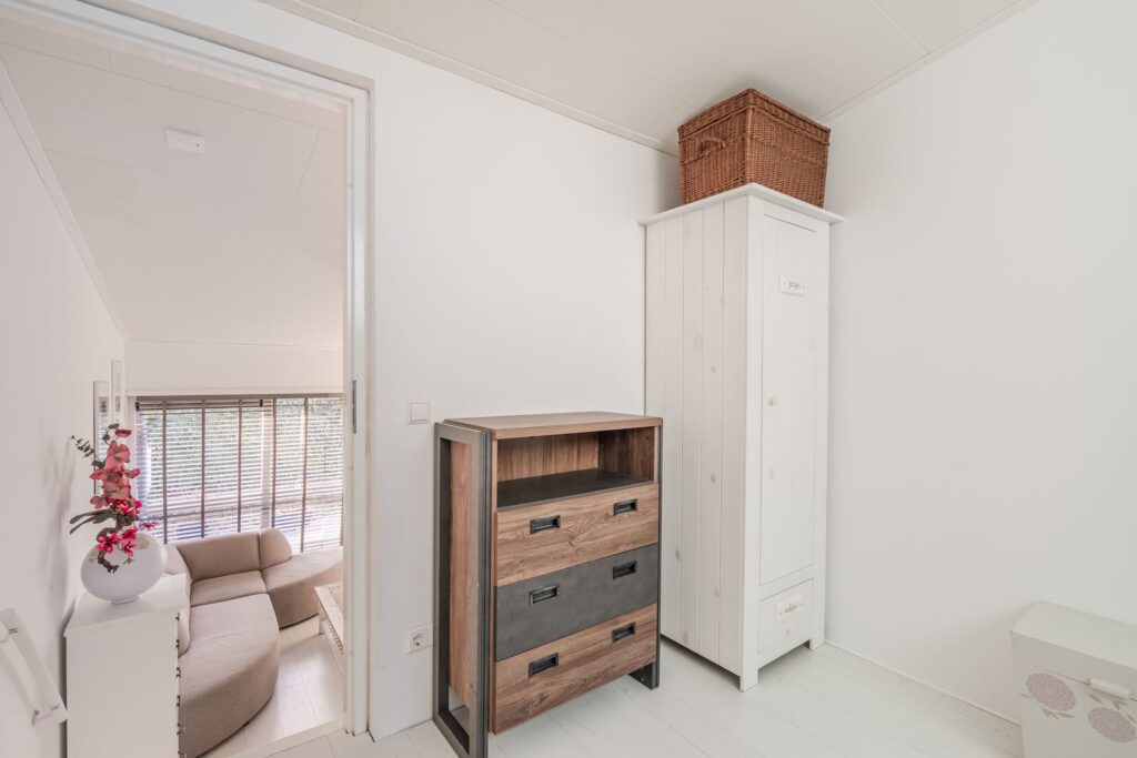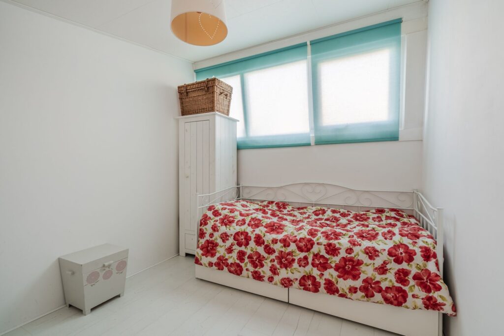 De ruim bemeten slaapkamer ligt op een lichte verhoging. De huidige bewoners hebben het trapje hiernaartoe aangepast en gedraaid, waardoor er extra ruimte in de woonkamer is ontstaan én praktische opbergruimte onder de trap.