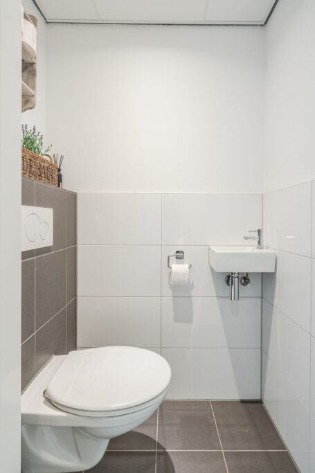 Aansluitend vindt u het separate toilet, modern betegeld en voorzien van een zwevend toilet.