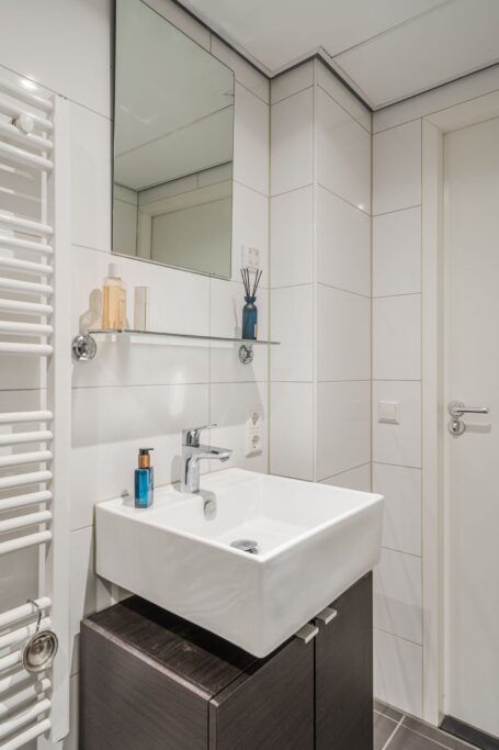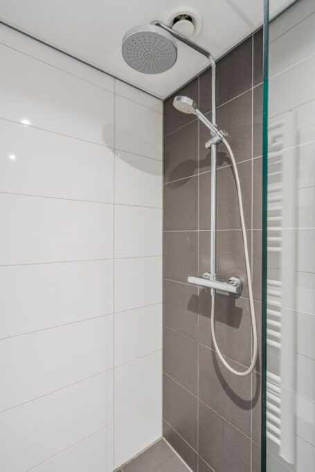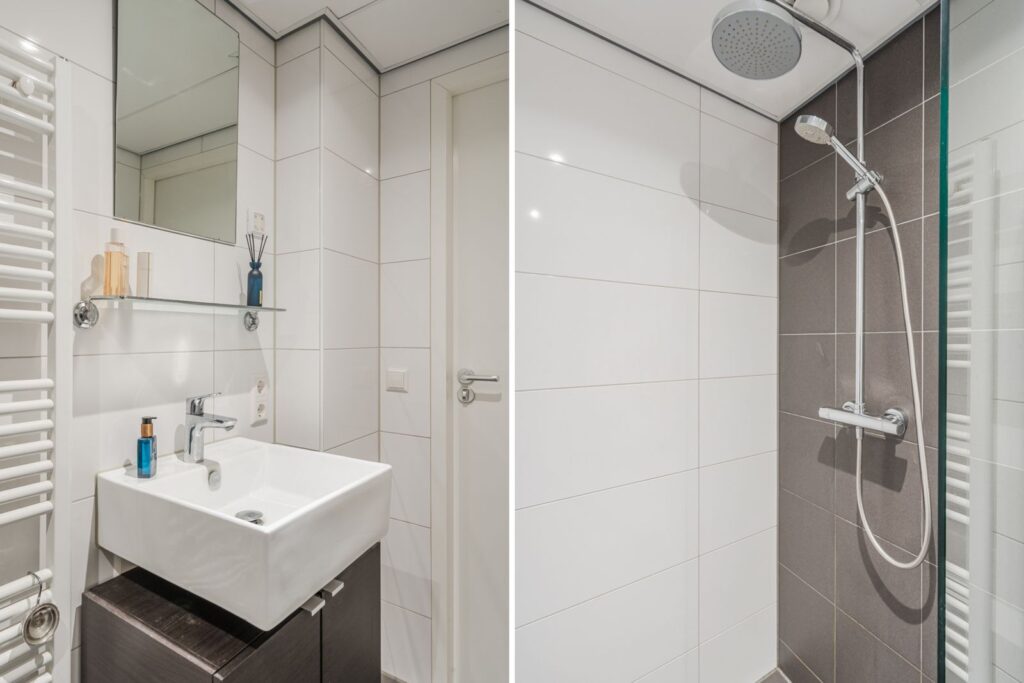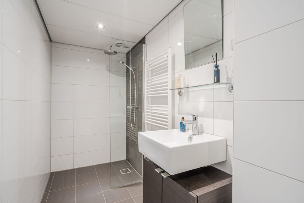 Aan de overzijde bevindt zich de badkamer, welke is uitgerust met een ruime inloopdouche, wastafel en designradiator. Tevens is er mechanische ventilatie aanwezig.