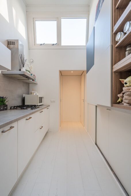 Onder de verhoging is plaats voor de wasmachine, de cv-ketel en extra bergruimte.