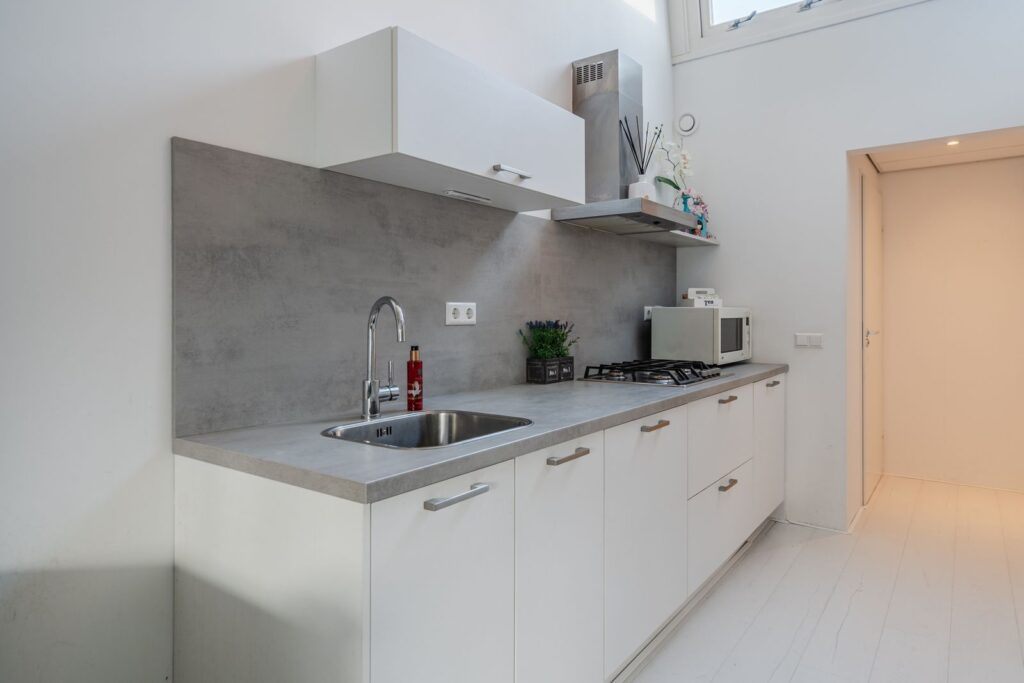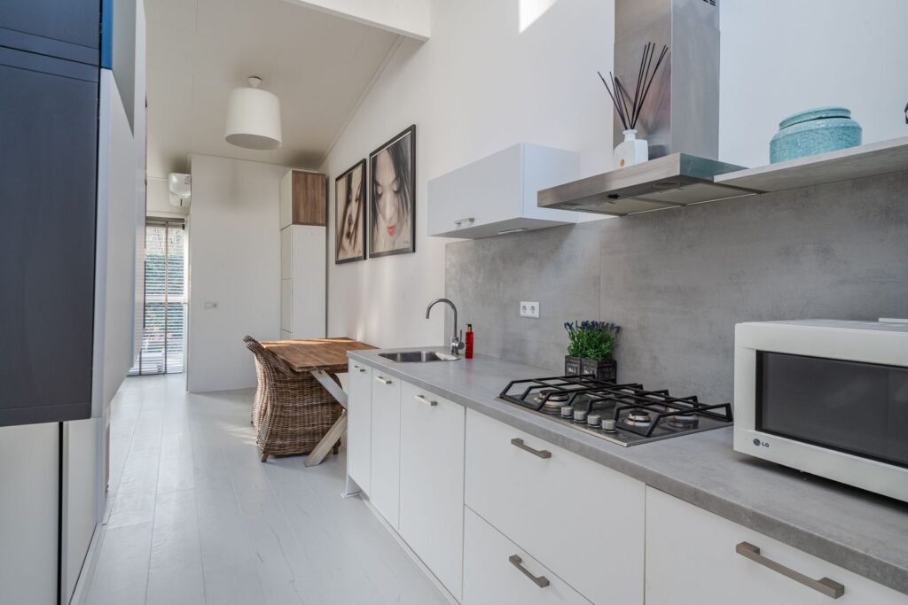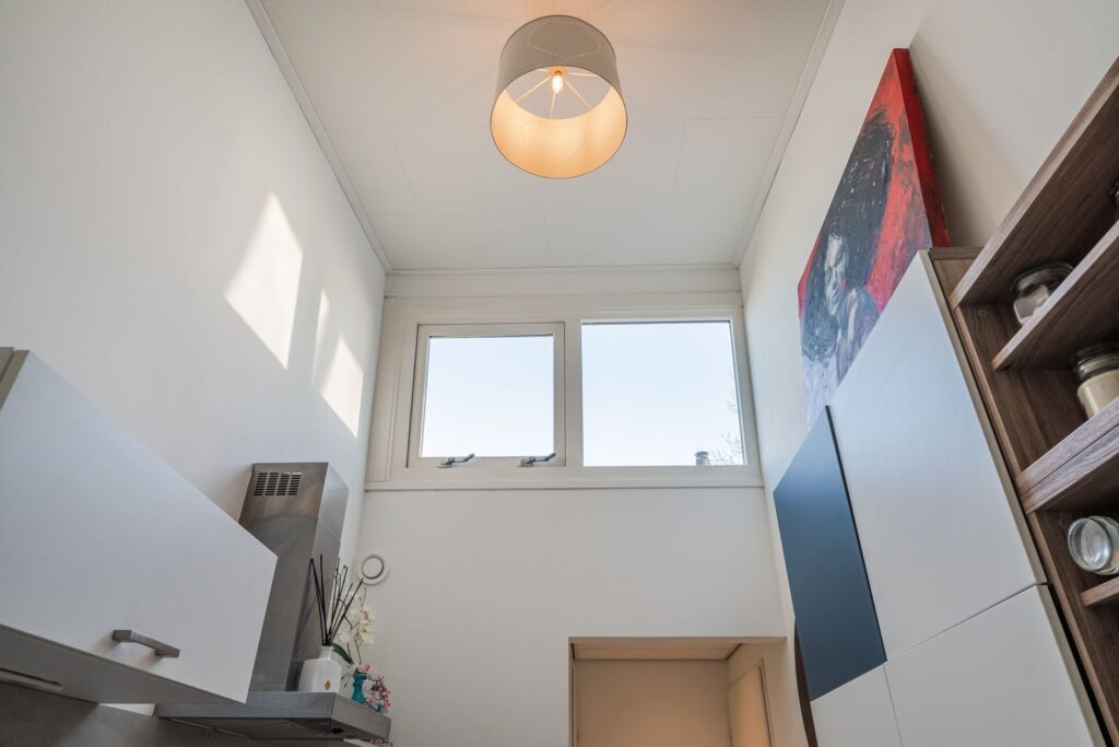 De moderne keuken staat in open verbinding met de woonkamer en is uitgerust met een gaskookplaat met afzuigkap, een inbouwkoelkast met vriesvak en voldoende kastruimte.