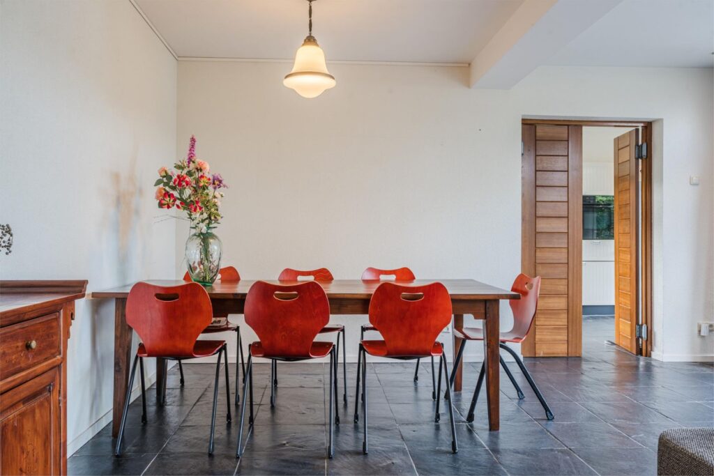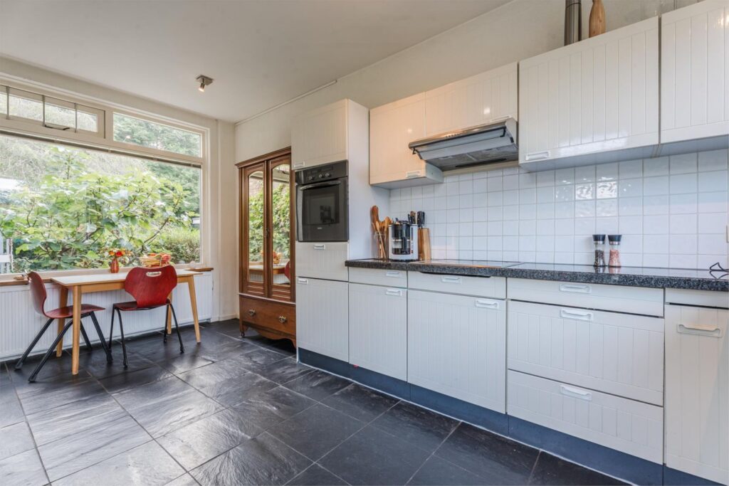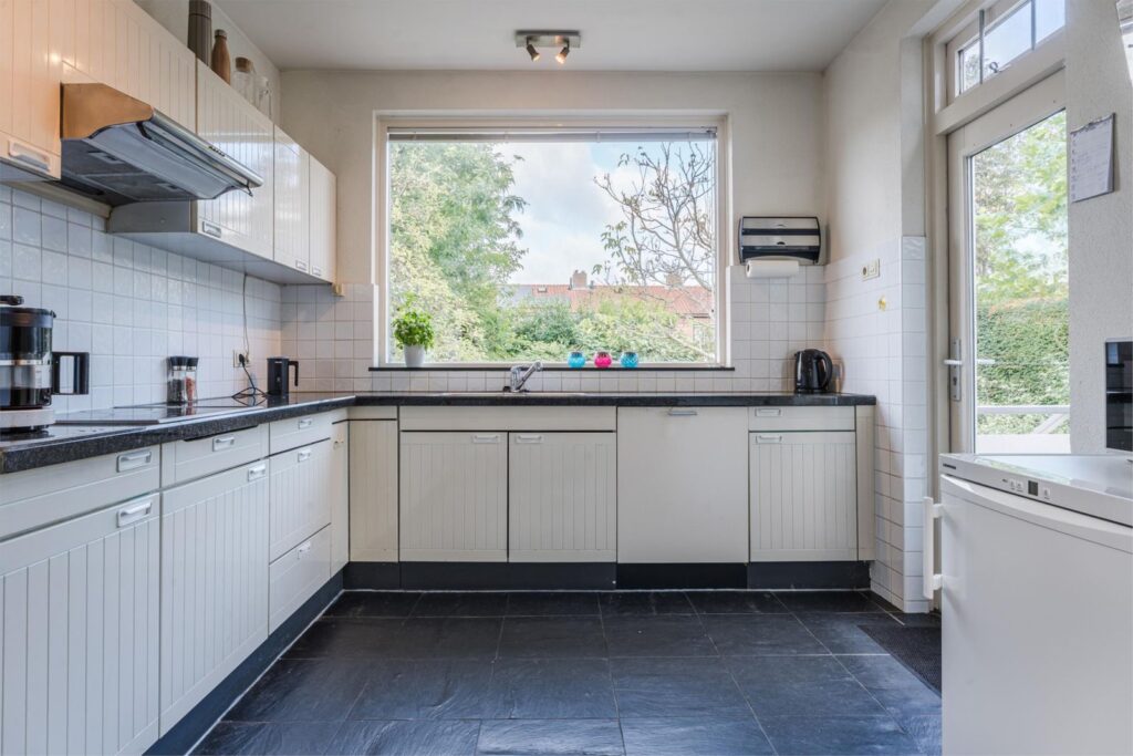 Voordeur met hal en toilet. Daarnaast centrale hal met trappenhuis. Toegang met zware klapdeuren naar de grote L-vormige woonkamer met licht van meerdere kanten. Er is een openhaard en dubbele openslaande deuren naar de tuin. Aan de achterzijde een elektrische zonneluifel over de hele breedte. Vanuit de woonkamer naar de grote keuken via zware klapdeuren. De ruime keuken heeft daglicht van meerdere kanten, elektrische zonwering, een close-in boiler, alle benodigde inbouwapparatuur en ruimte voor een eettafel. Ook vanuit de keuken is er een deur naar het terras en de achtertuin. Op gehele begane grond ligt Belgische natuursteen.