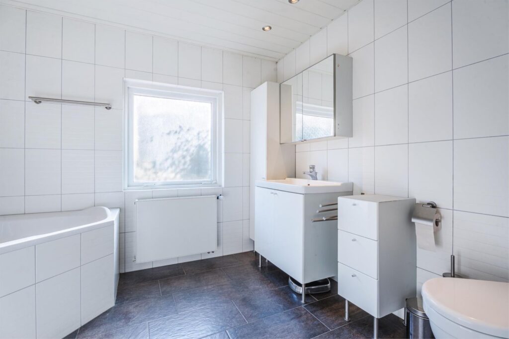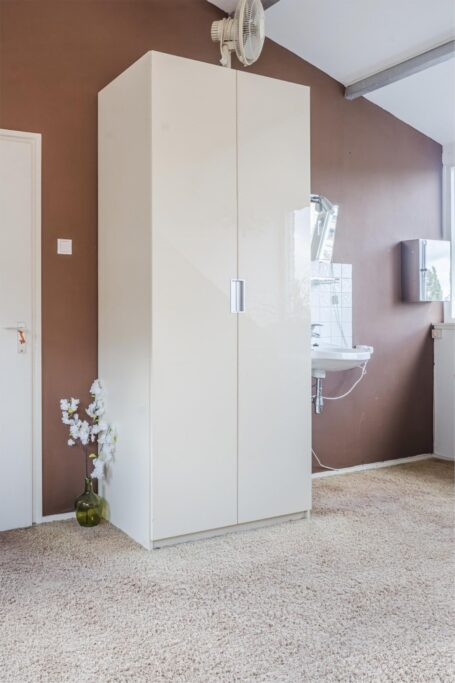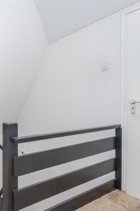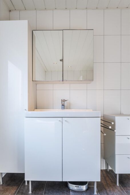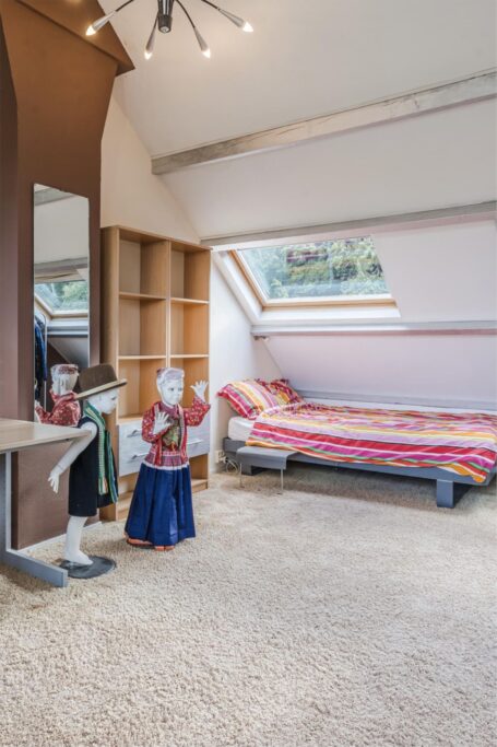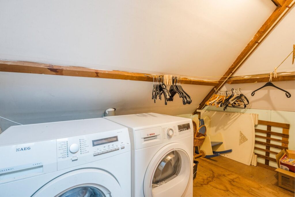 Een overloop en ruime slaapkamer met wastafel. De kamer heeft een dakkapel met elektrisch rolluik en twee grote dakramen en opbergruimte achter de knieschotten. Daarnaast vanaf de overloop nog twee ruimtes die dienst doen als was- en droogruimte en voor de verwarmingsketel met zonneboiler.