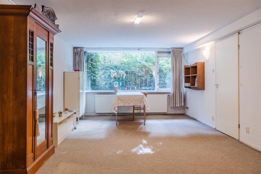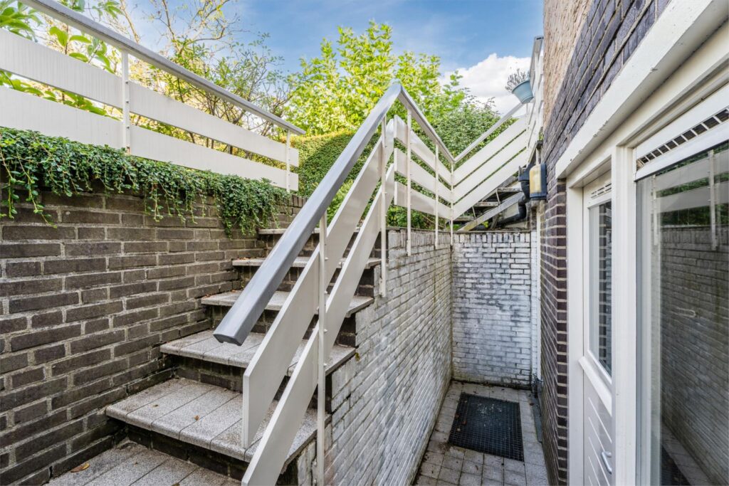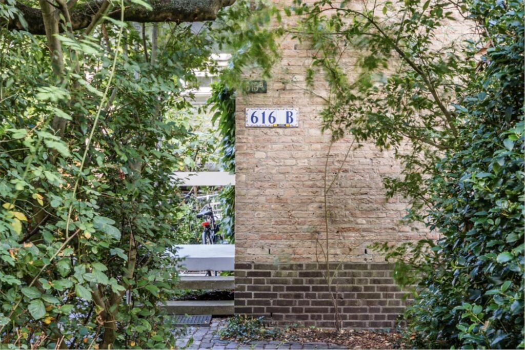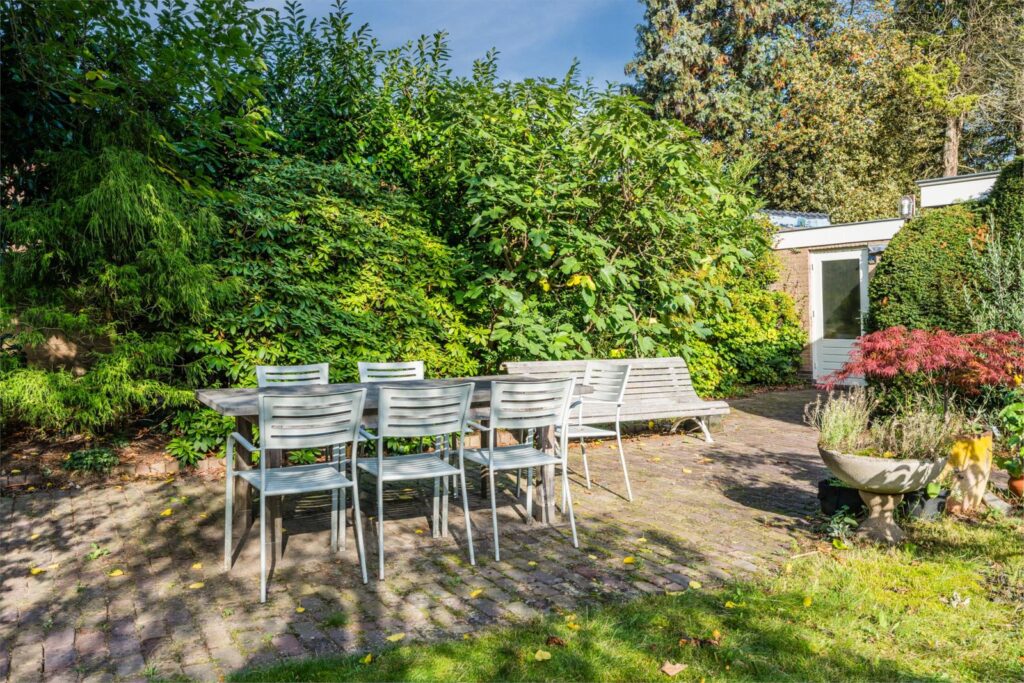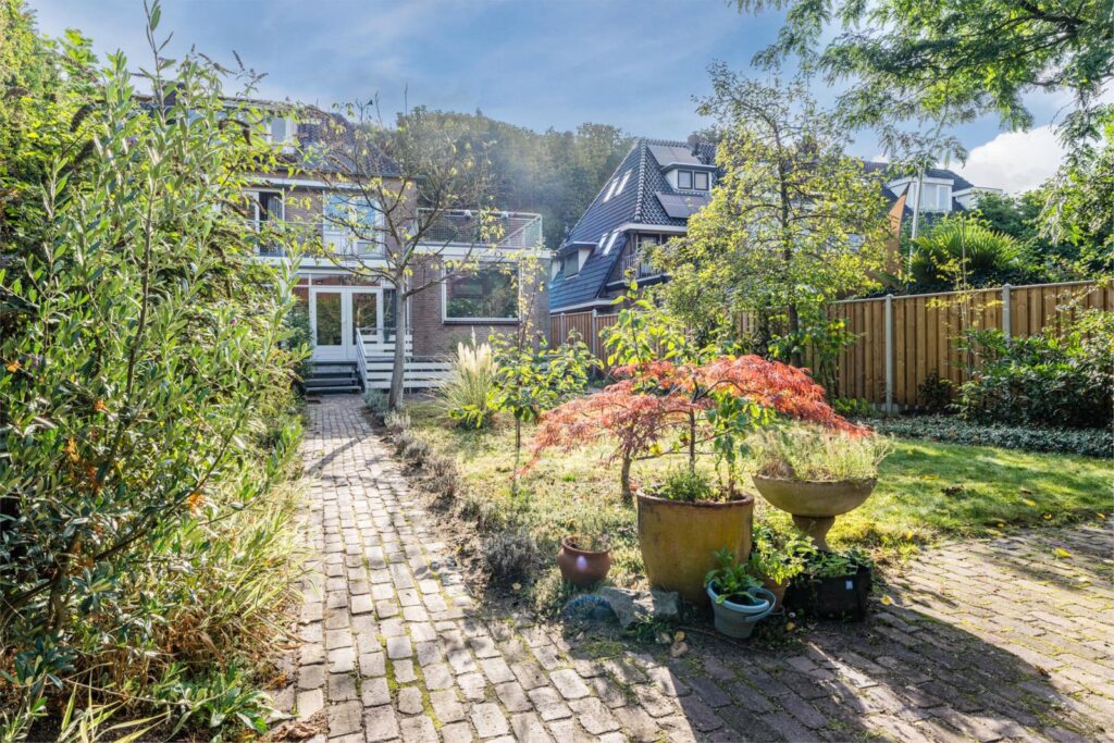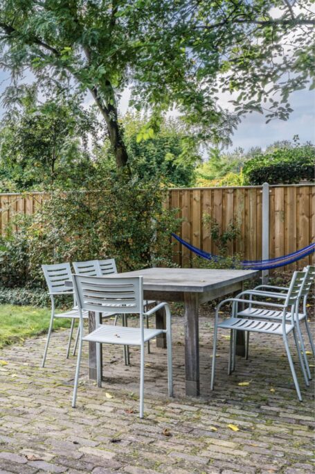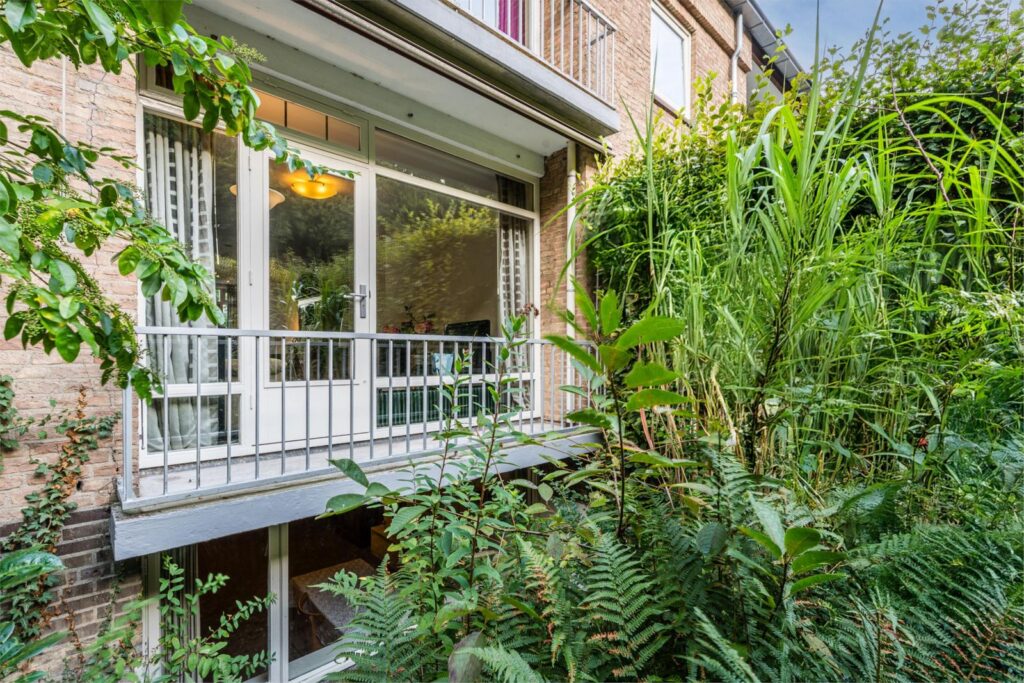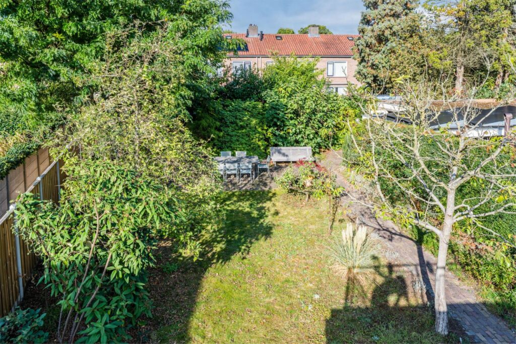 De natuurvriendelijke tuin met twee terrassen, gras, bloemen, planten en fruitbomen ligt op het zuidwesten en is zo diep dat er altijd zon is. Veel privacy en de keus om op het terras bij het huis te zitten als wel achterin in de schaduw van twee grote bomen. De voortuin met veel groen zorgt voor een natuurlijke afscheiding van de St. Annastraat. Een achterom met poort naast het huis en ook aan de achterkant via de garage/ schuur.