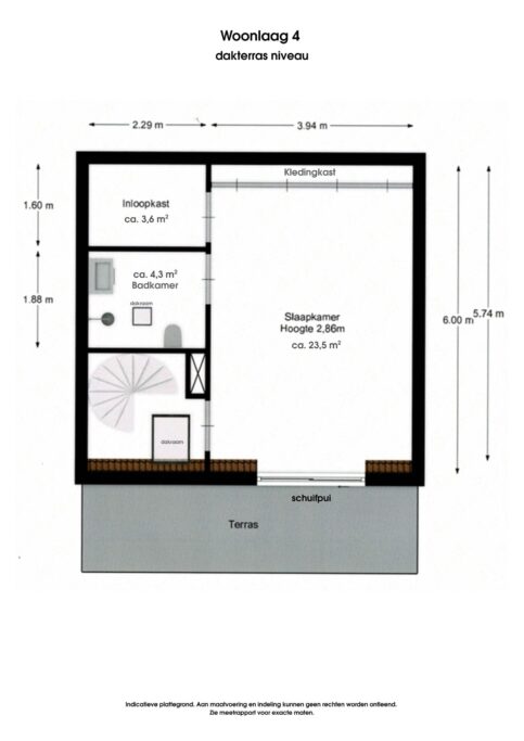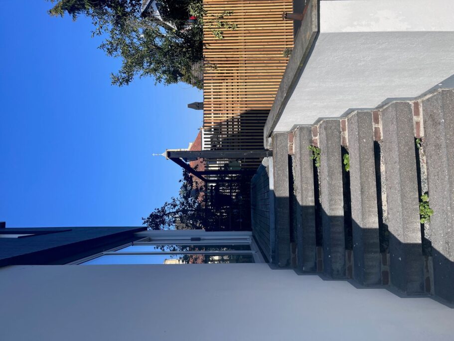 De woning beschikt over een zijterras, balkon, dakterras en een beschutte achtertuin. In de tuin staat een praktische houten schuur (ca. 15 m²), verdeeld in twee delen voor fietsen, opslag of hobby.