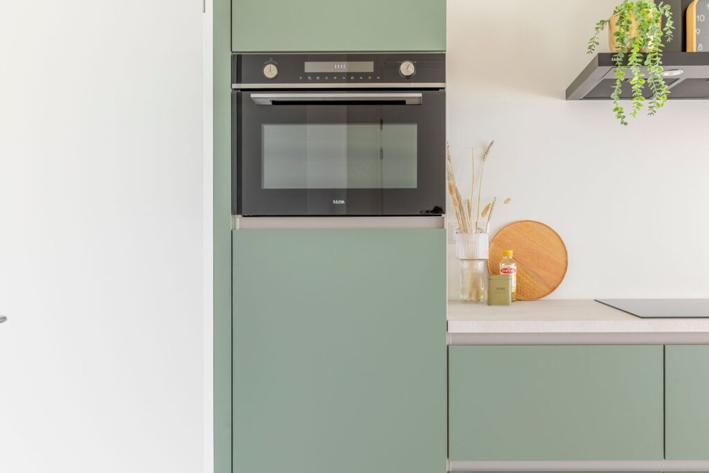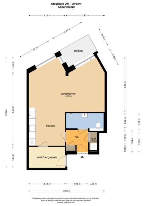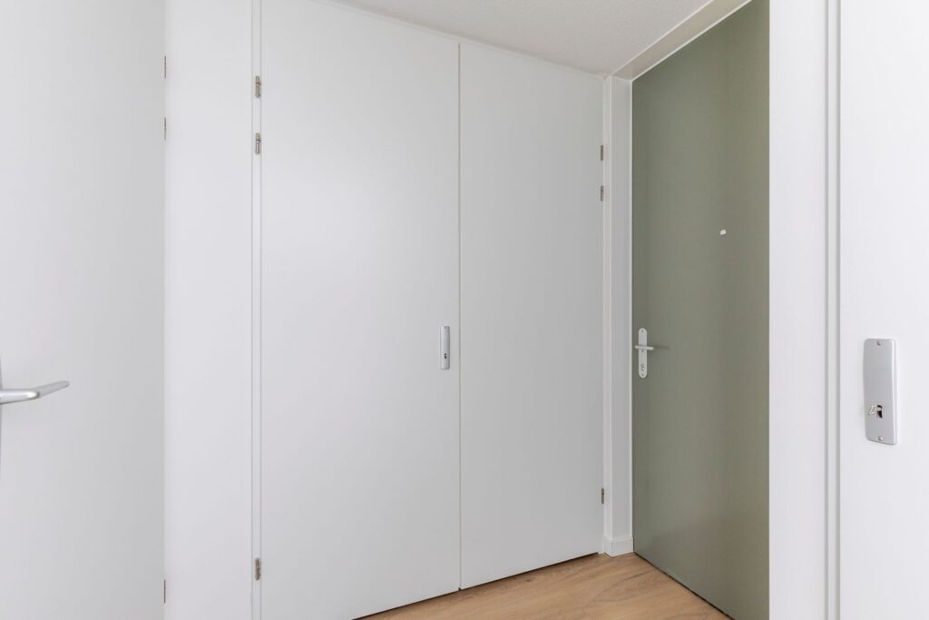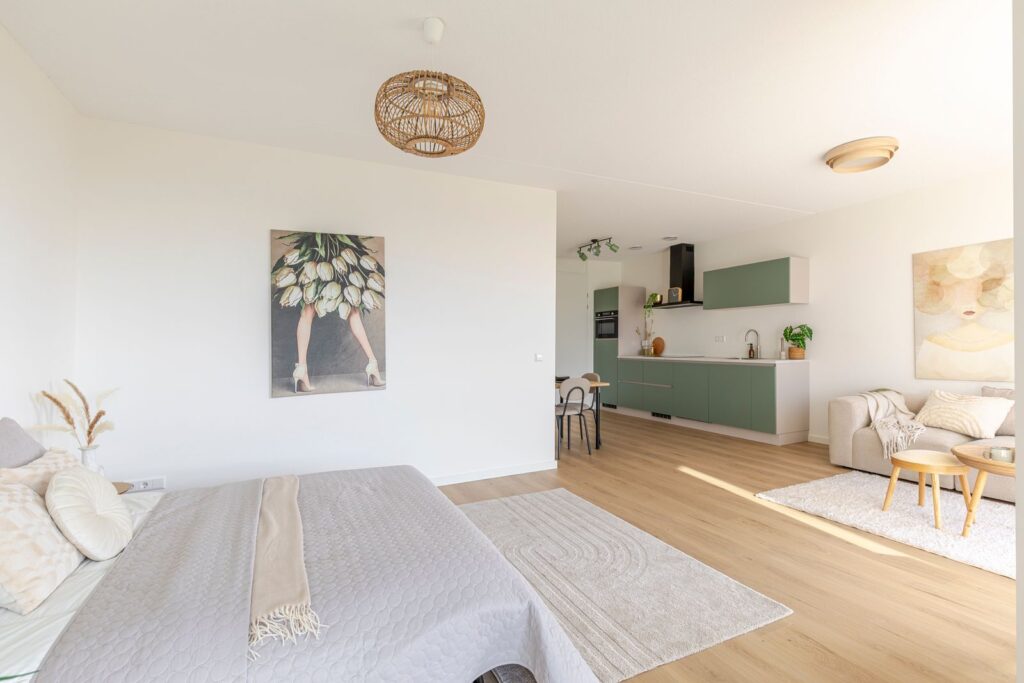 Bij binnenkomst kom je in de hal met toegang tot de badkamer, een praktische bergkast met wasmachineaansluiting en de woonruimte. De woonruimte is heerlijk licht door de grote ramen en heeft een moderne open keuken. De keuken is uitgevoerd in een rustige groene tint en voorzien van een inductiekookplaat, combi-oven, vaatwasser en koelkast. Daarnaast is er een Quooker aanwezig. Er is voldoende ruimte voor een gezellige zithoek en eettafel. Het slaapgedeelte bevindt zich aan de raamzijde en staat in open verbinding met de woonkamer, wat zorgt voor een ruimtelijk en licht gevoel. Vanuit hier heb je direct toegang tot het balkon. Het balkon ligt op het zuiden en heeft daardoor de hele dag zon. Dankzij de glazen windschermen zit je hier ook bij wat meer wind comfortabel buiten. Het uitzicht over de spoordijk en richting de skyline van Utrecht maakt dit een heerlijke plek om te zitten. De badkamer is modern en compleet uitgevoerd met een inloopdouche, wastafel en toilet. Tot slot is er een aparte werk- of bergruimte aanwezig, ideaal als thuiswerkplek of extra opslag.
