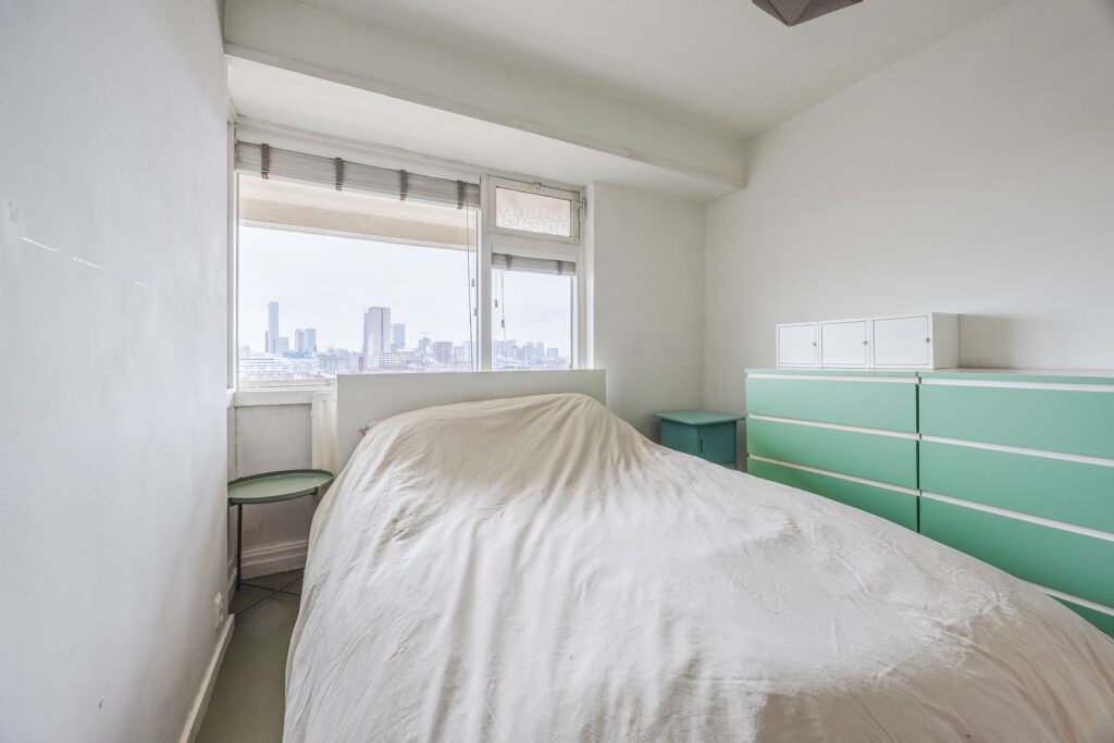 De slaapkamer biedt eveneens uitzicht over de skyline van het centrum van Rotterdam. Hoe prettig wakker worden is dát!