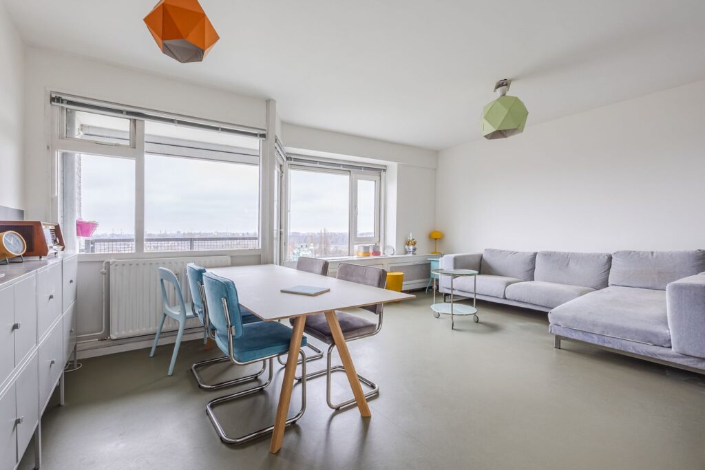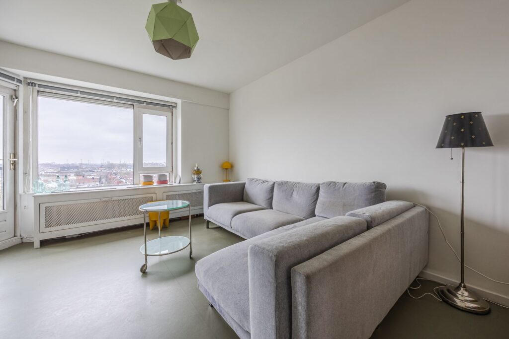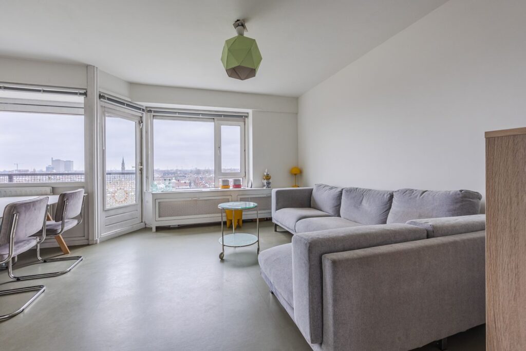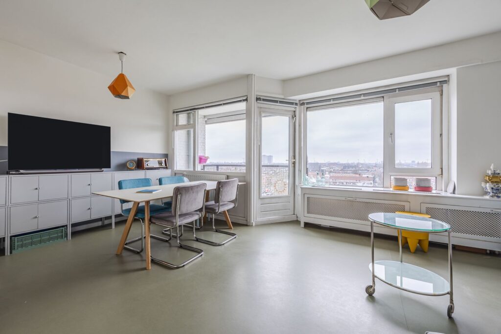 De woonkamer (ca. 4.57 x 5.80m) biedt prachtig uitzicht en fijne lichtinval door een grote raampartij met een brede vensterbank. Het gehele appartement, behalve de badkamer, is voorzien van een effen marmoleum vloer en nette gladde wanden. De grote raampartij is voorzien van een electrisch zonnescherm.