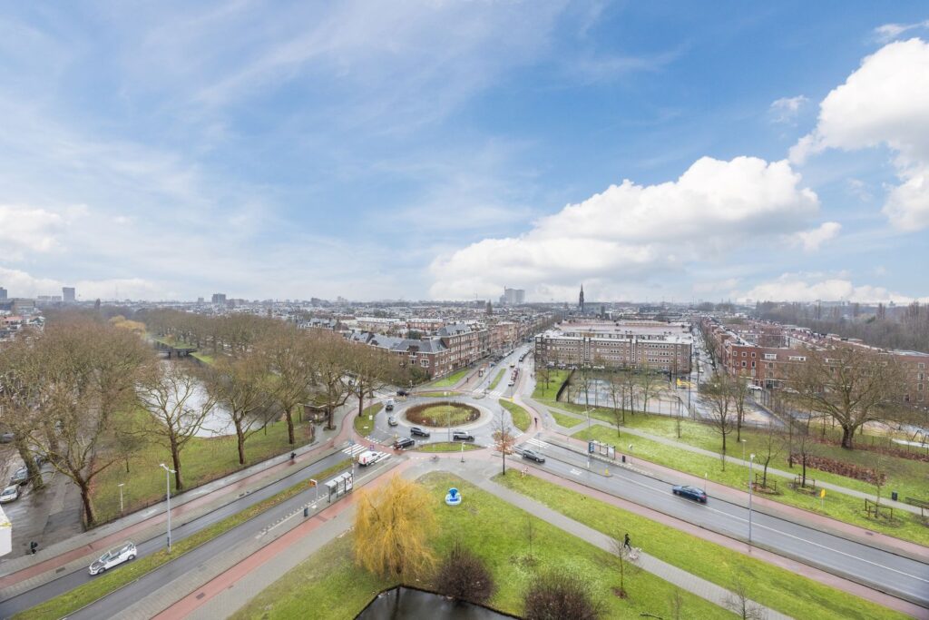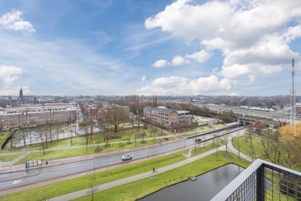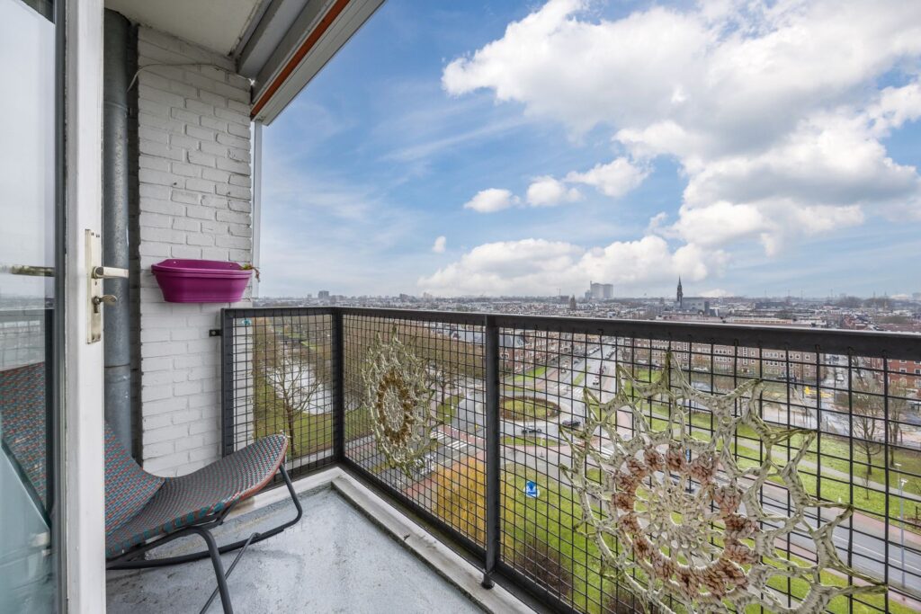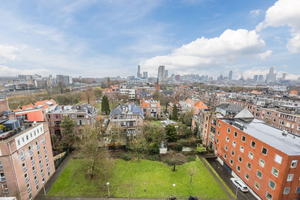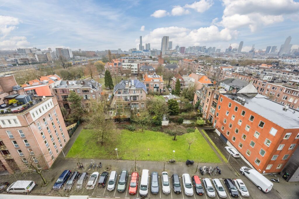 Vanuit de woonkamer is er toegang tot het op het zuidwesten gelegen balkon met stalen hekwerk, met een adembenemend uitzicht op de prachtige Heemraadssingel en de havens van Rotterdam.