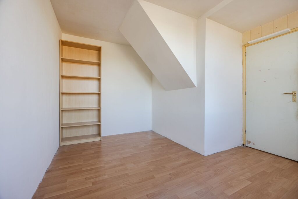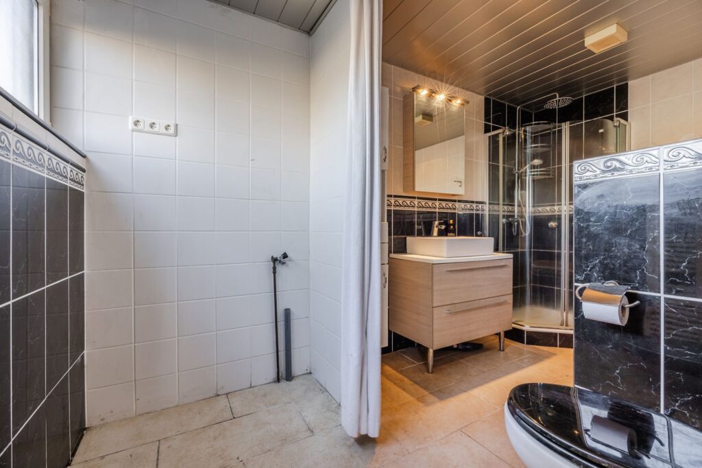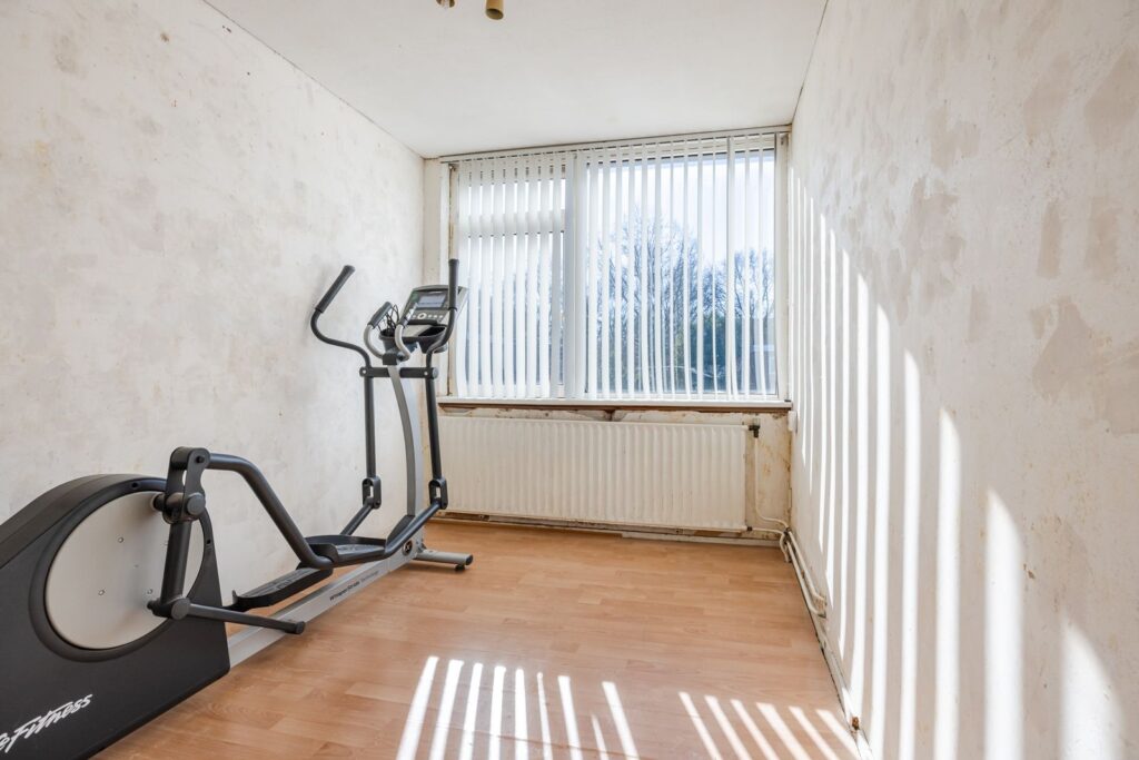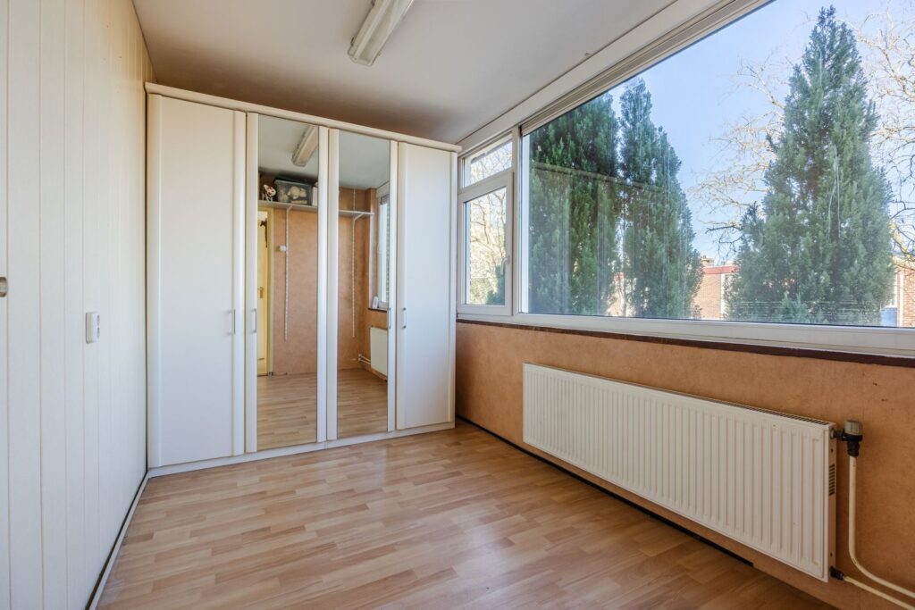 De open trap gaat naar de overloop. Hier bevinden zich 4 slaapkamers waaronder een zeer ruime ouder slaapkamer aan de tuinzijde met een vaste kast met schuifdeuren. Ook is er nog toegang tot een ruimte waar eventueel een tweede toilet gesitueerd kan worden.