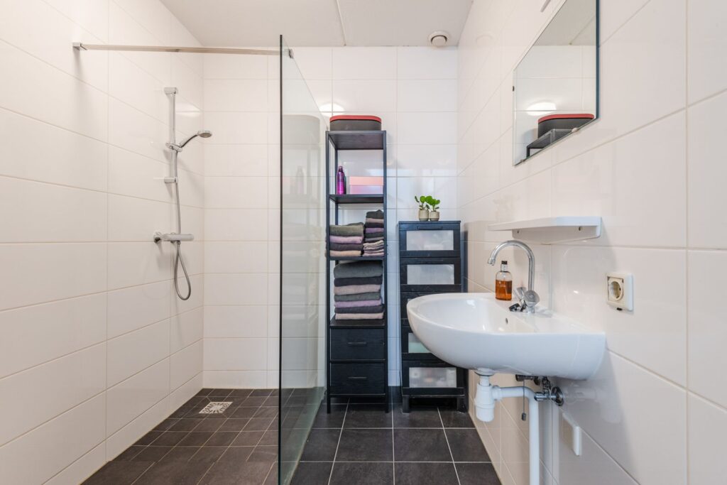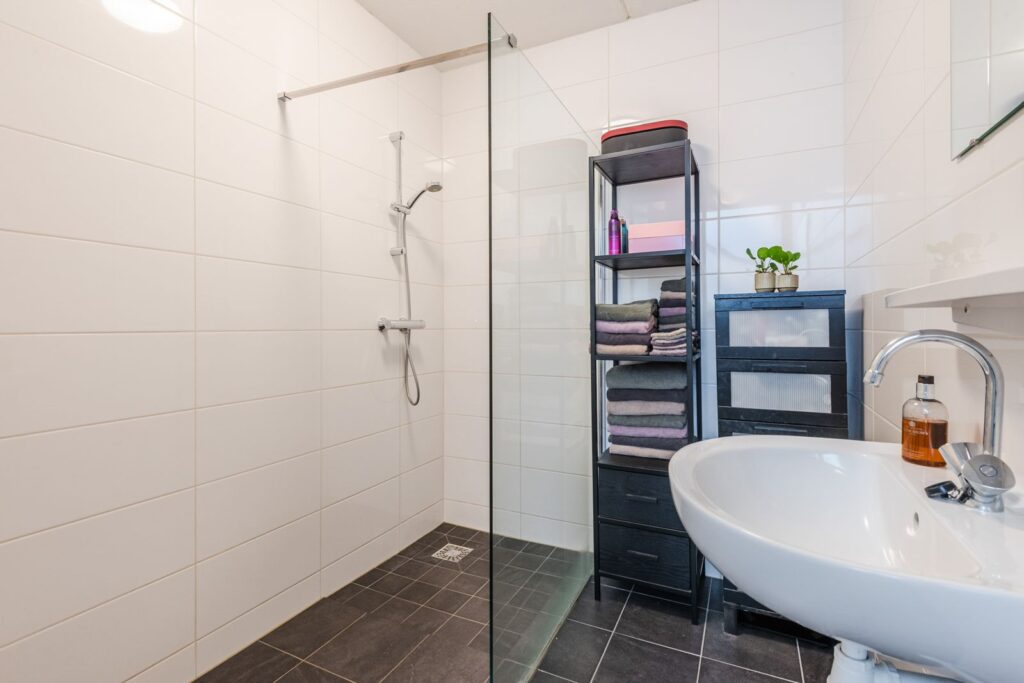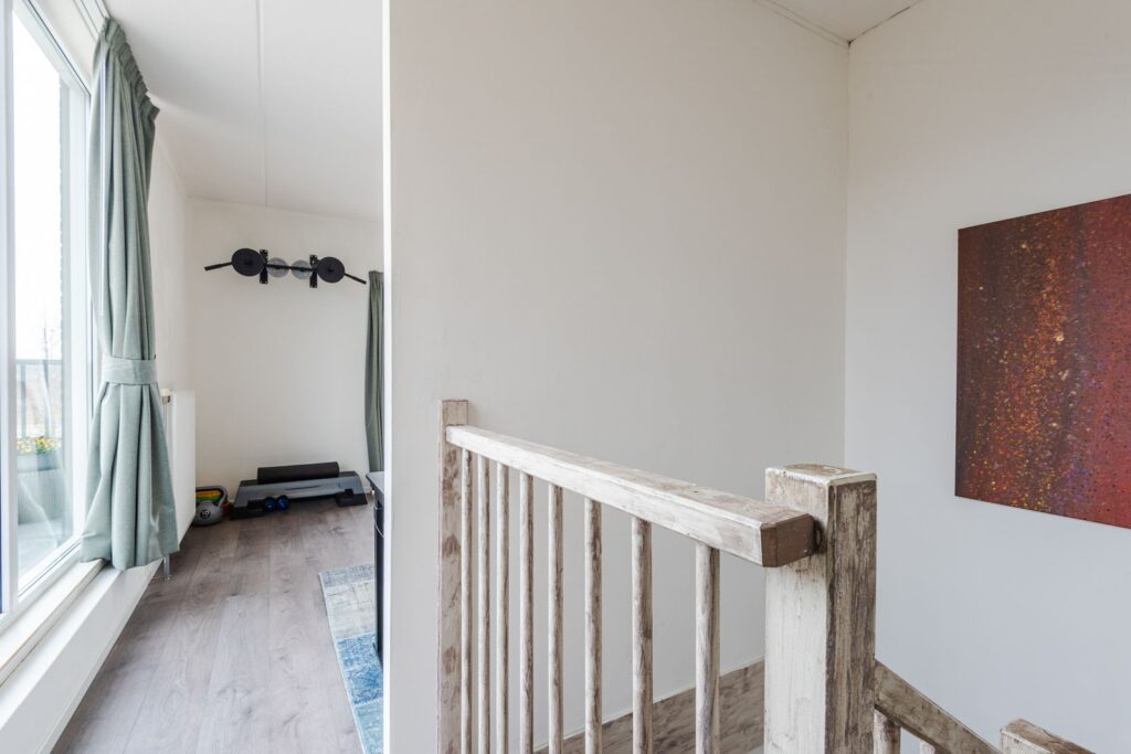Overloop, slaapkamer, inloopkast/kamer, wasruimte en de Cv-kast. Op dit moment is de tweede slaapkamer op deze verdieping in gebruik als inloopkast. Het is makkelijk om weer een slaapkamer te realiseren, de deur is nog aanwezig. De badkamer is voorzien van een inloopdouche, wastafel en de mogelijkheid voor een tweede toilet.