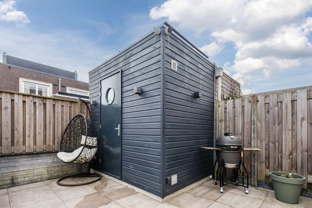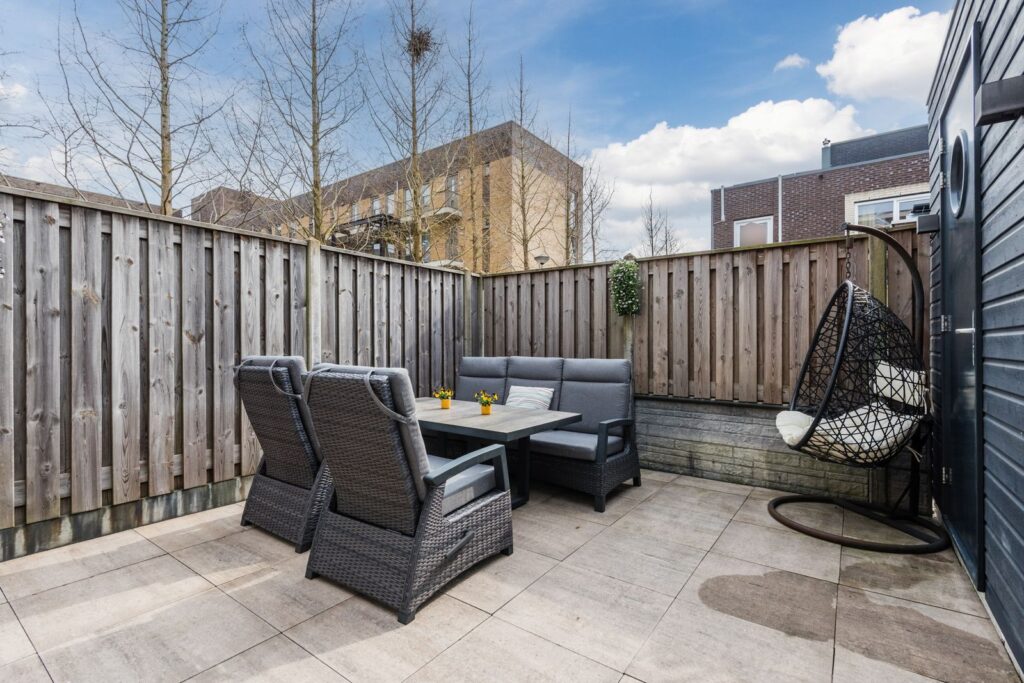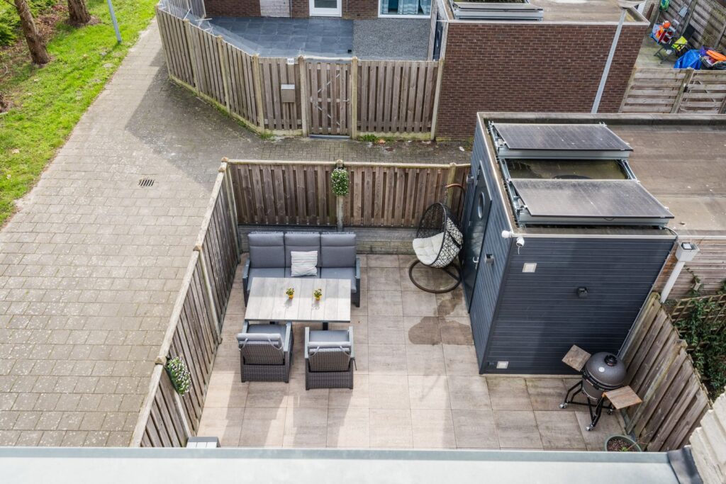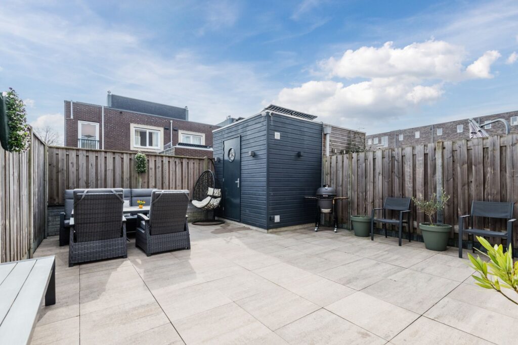 Heerlijk zonnige tuin met een nette schutting/bestrating en een houten berging. Extra brede poort, handig voor verhuizen of de motor.