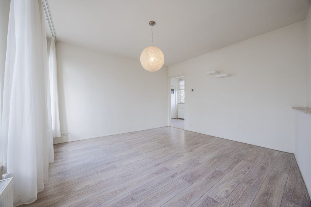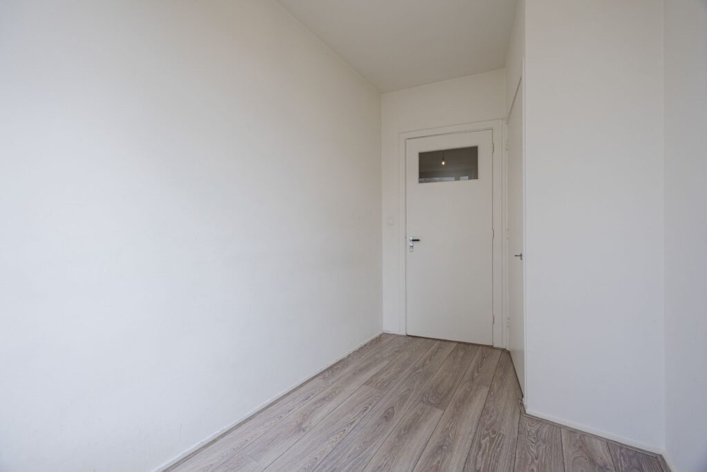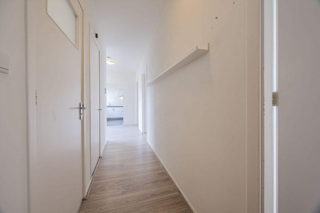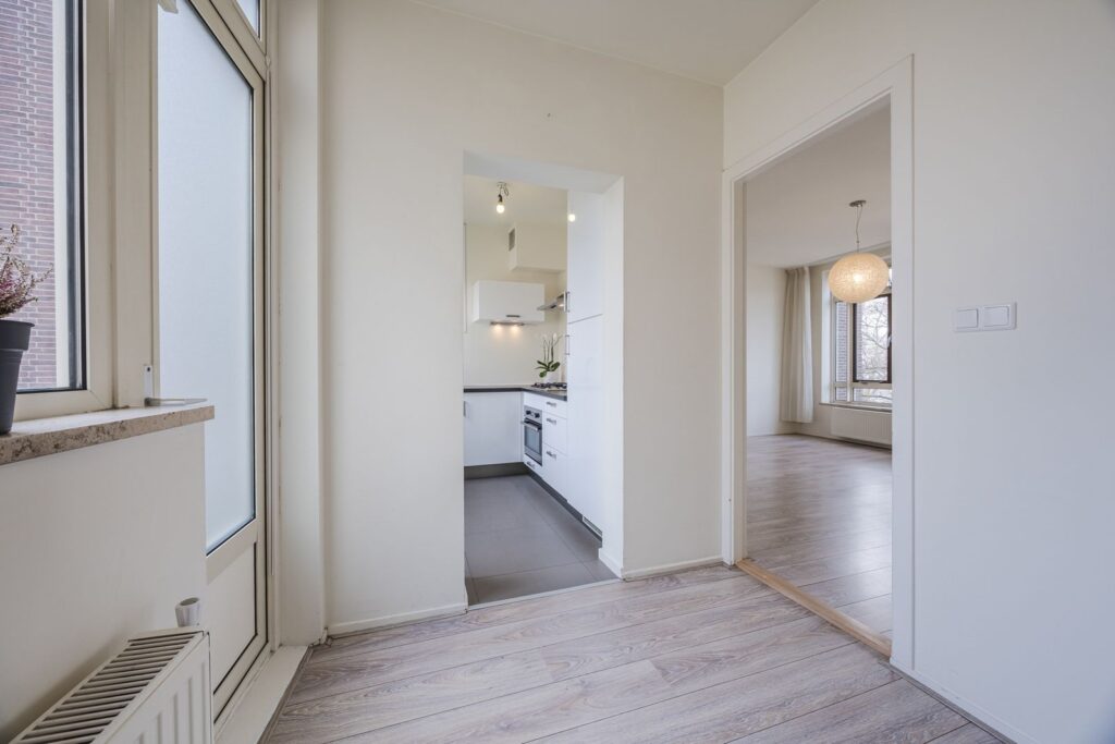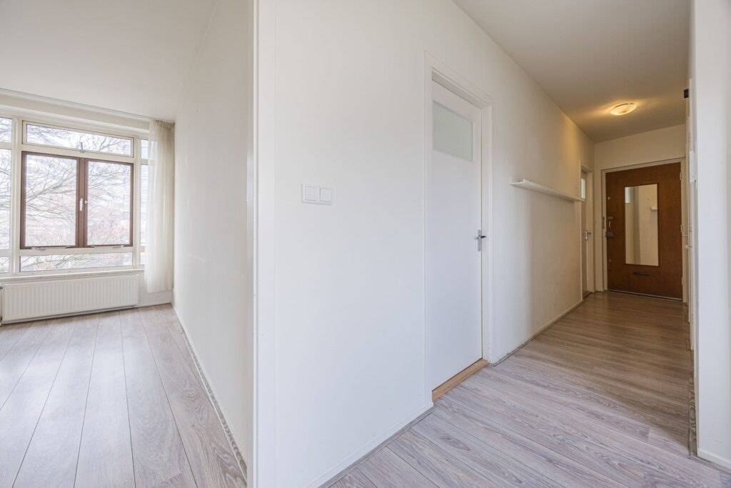Afgesloten entree met intercom en trappenhuis naar de derde verdieping. Entree appartement, gang, lichte woon-/eetkamer aan de voorzijde, moderne keuken, twee slaapkamers aan de achterzijde met toegang tot het balkon, moderne badkamer, separaat toilet.