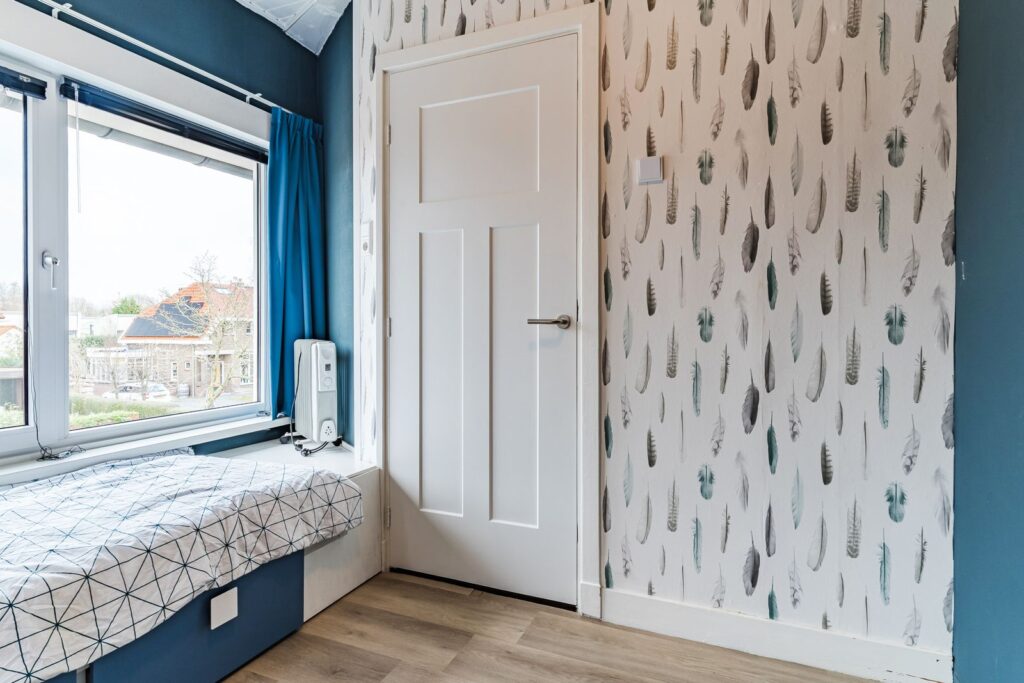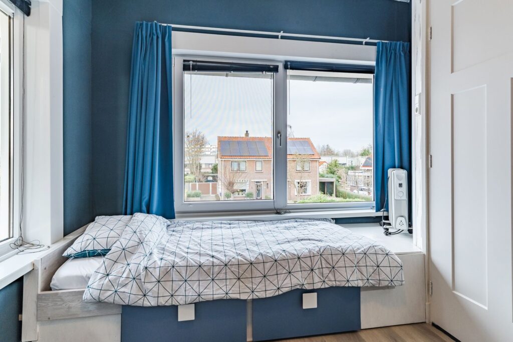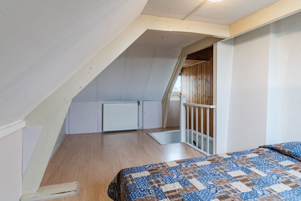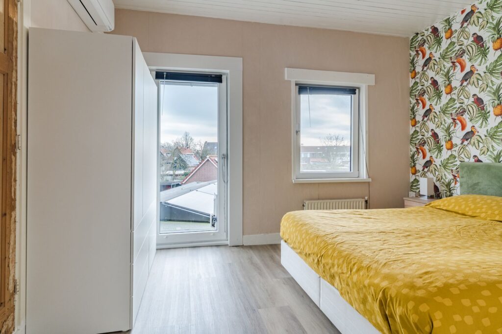 Overloop met vaste inbouwkast, toilet met sanibroyeur (2022), wasbak en inbouwkast, grote slaapkamer aan achterzijde is voorzien van een inbouwkast, airco-unit en kiepkantelraam welke kan dienen als deur en toegang geeft tot plat dak. De slaapkamer aan de voorzijde heeft een vast bed en elektrische verwarming. Alle kozijnen zijn kunststof en voorzien van HR++ glas.