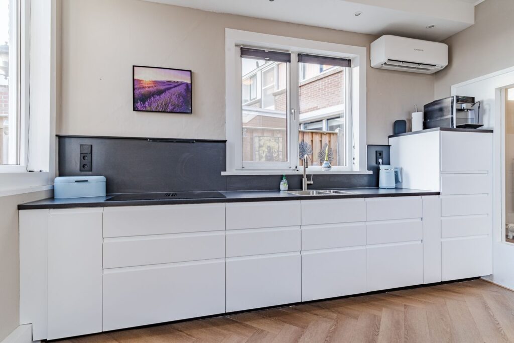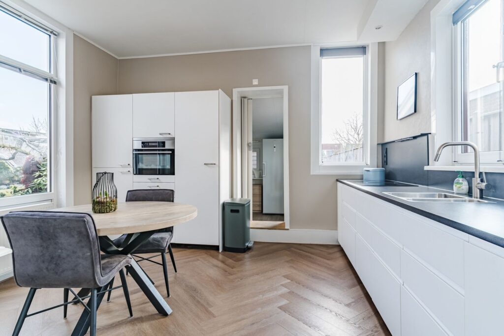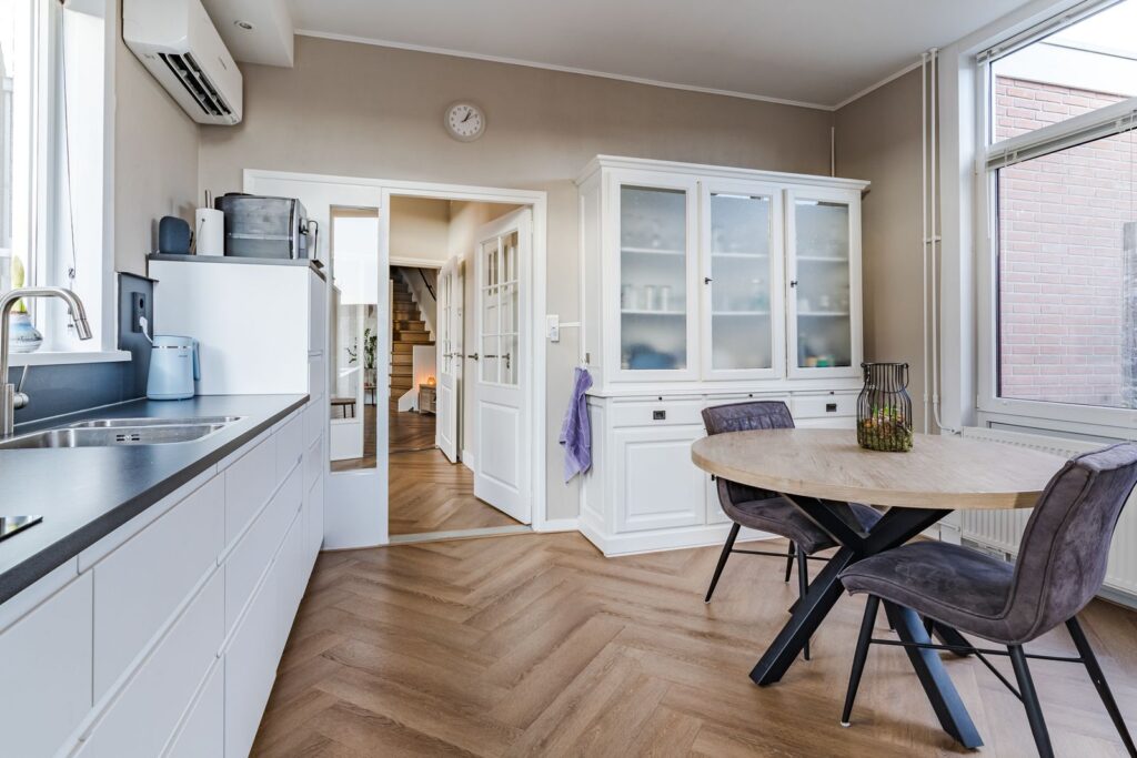 De keuken is gelegen aan de achterzijde en is uitgevoerd met nieuwe keukenopstellingen (2022) aan de zijkant van de keuken en een opstelling tegen de achterzijde. De uitrusting bestaat uit een 1,5 spoelbak, 4-pits inductiekookplaat met geïntegreerde afzuiging, combi-oven, koelkast en een vaatwasmachine. Aanwezigheid is een airco-unit en kunststof kozijnen met HR++ glas en horren.