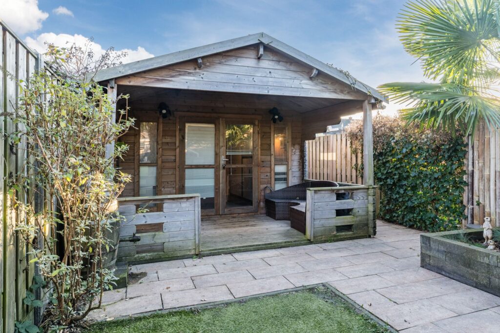 - Houten tuinhuis met veranda 3,35x3,37 voor bijvoorbeeld werken aan huis, volledig geïsoleerd, met airco-unit, elektrische aansluitingen, meterkast en glasvezel en internetverbinding