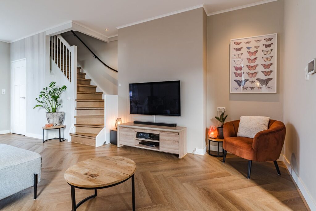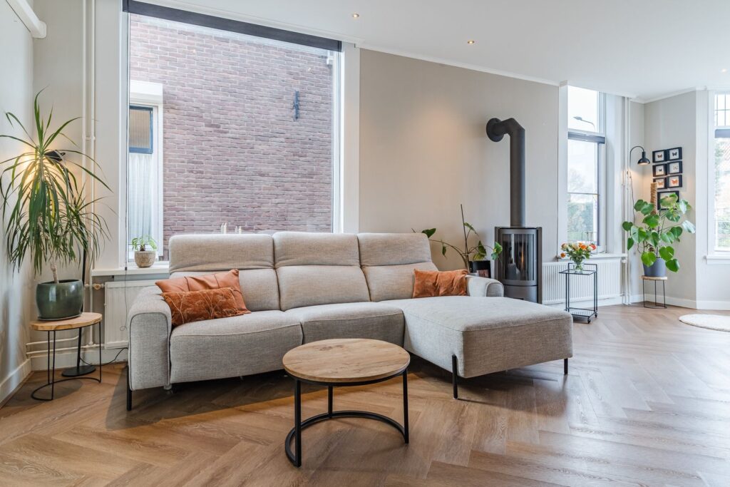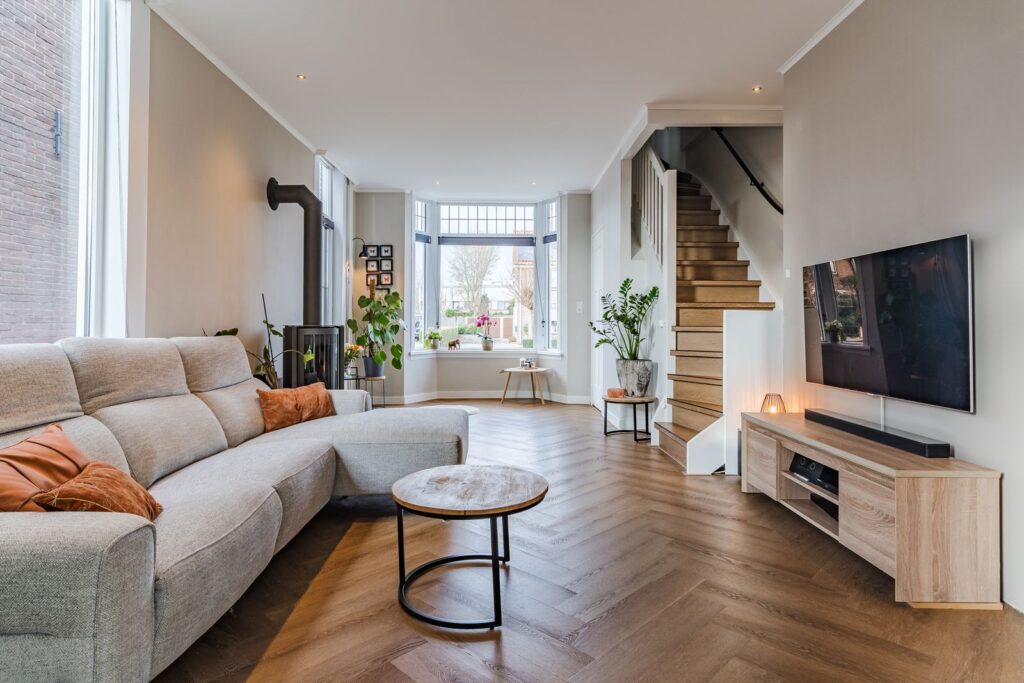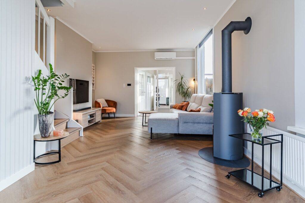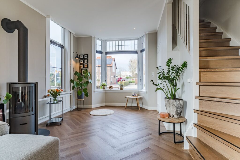 De woonkamer is voorzien van een erker met zicht naar de voorzijde van het huis en aan de zijkant bevinden zich meerdere ramen welke veel lichtinval verzorgen. In 2020 is er een spanplafond geïnstalleerd in de woonkamer. De houtkachel (2021) zorgt voor extra sfeer en warmte en is op 3 manieren in te stellen. In de woonkamer is een airco-unit (2023) aanwezig. In het midden bevindt zich een nieuwe vaste trap (2022) naar de eerste verdieping met pcv traprenovatie.