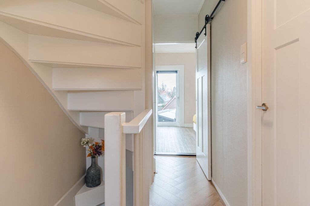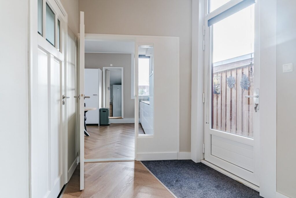 In de tussenhal is toegang naar een royale inbouwkast, badkamer, keuken en buitendeur naar de tuin.