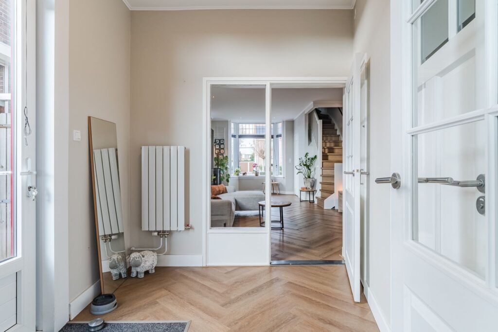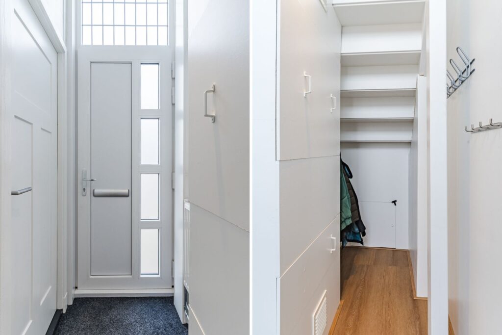 De hal geeft toegang tot de woonkamer en heeft hier de meterkast en garderobe. De pvc visgraat vloer loopt door in woonkamer, tussenhal en keuken.