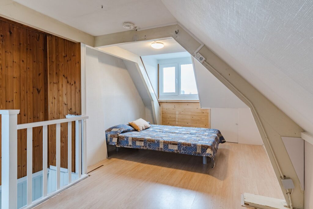 Vaste trap die uitkomt in een ruime kamer met kunststof dakkapel (2022) voorzien met HR++ glas, veel bergruimte onder knieschotten. De oude houten dakkapel aan de voorzijde wordt gedeeld met de buren.