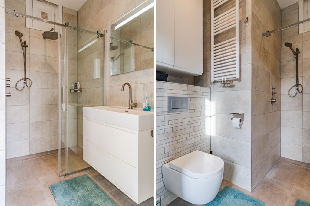 Badkamer is voorzien van ruime douche met glazen schuifdeurwanden, regendouche en handdouche. Het moderne wastafelmeubel met spiegel en verlichting en spiegelverwarming biedt volop gebruiksgemak, terwijl het toilet het sanitair compleet maakt. Ook aan opbergruimte is gedacht, en de designradiator zorgt tenslotte voor de verwarming.