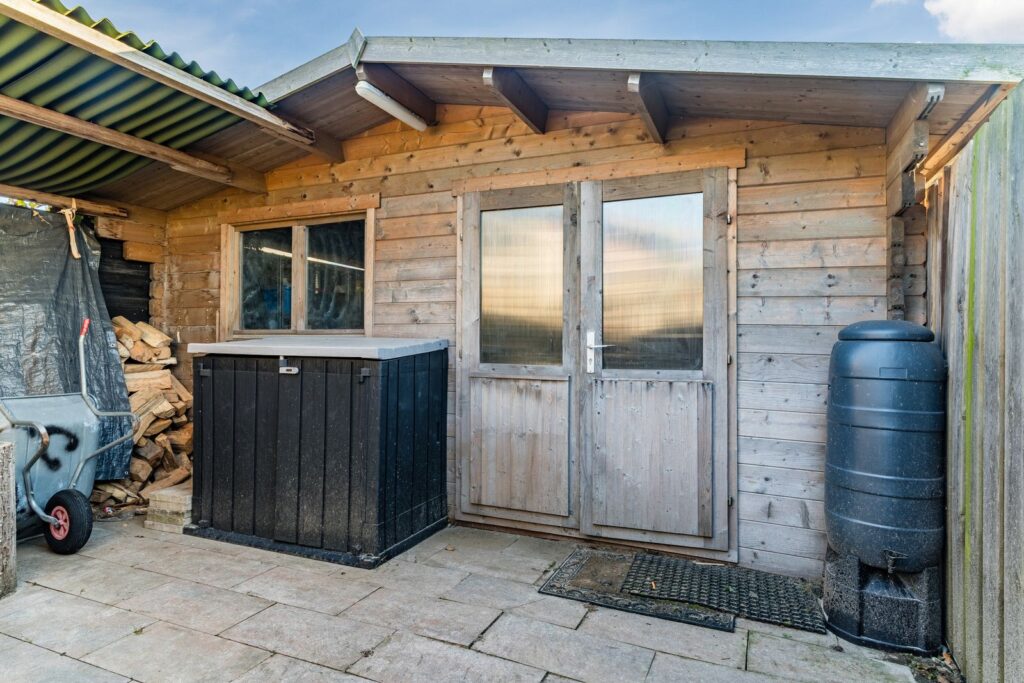 - Houten berging 4,72x4,73 achterin de tuin voorzien van elektra