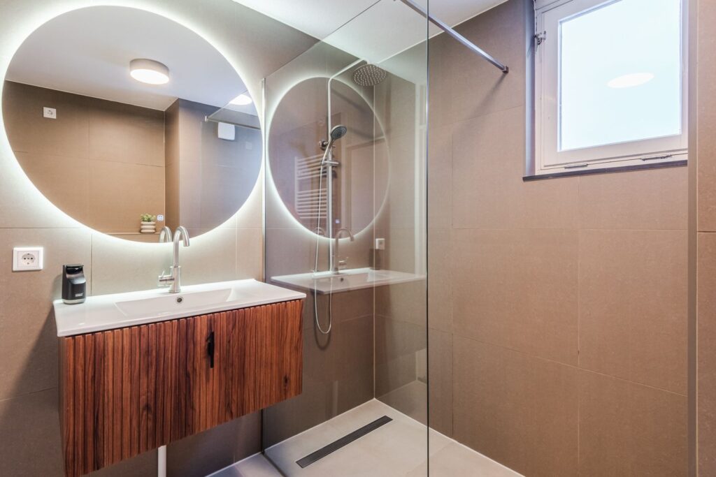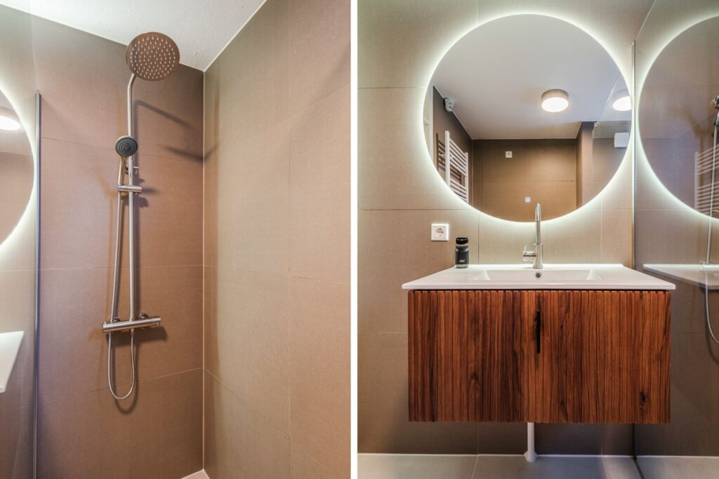 De badkamer is in 2025 volledig gerenoveerd en voorzien van een inloopdouche, zwevend toilet en een luxe wasmeubel met moderne spiegel.