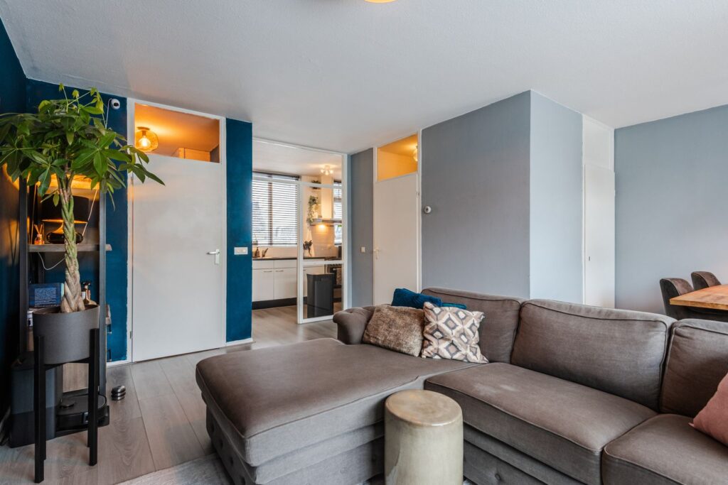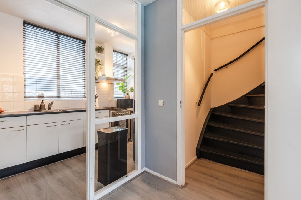 Begane grond: Ruime hal met vernieuwde meterkast (glasvezel aanwezig). Lichte woonkamer voorzien van laminaat met voldoende ruimte voor een eethoek. Ruime kast bevindt zich onder de trap voor praktische doeleinden. Dichte keuken met een rechte opstelling bestaande uit witte kastjes, gasfornuis en vaatwasser. Nieuw betegeld en modern toilet (2025).